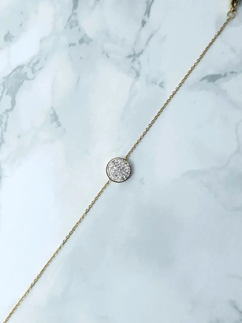 My kobiety kochamy błyskotki. Każda stylizacja potrzebuje dodatków, a nawet te najmniejsze są bardzo ważne. Mowa tu o pięknej biżuterii, która podkreśli to co najlepsze. Wspaniała bransoletka na łańcuszku z małym kółeczkiem wypełnionym cyrkoniami. Kółeczko zostało wykonane z wysokiej jakości tworzywa, natomiast łańcuszek to stal nierdzewna. Modny wzór na który każda z nas zwróci uwagę. Możliwość regulacji długości bransoletki. Sprawdź całą naszą kolekcję biżuterii i wybierz swój ulubiony dodatek.