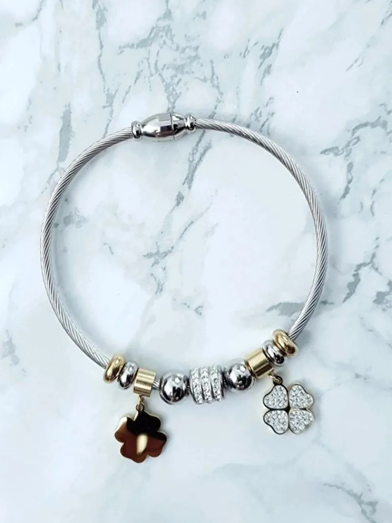My kobiety kochamy błyskotki. Każda stylizacja potrzebuje dodatków, a nawet te najmniejsze są bardzo ważne. Mowa tu o pięknej biżuterii, która podkreśli to co najlepsze. Delikatna bransoletka ze stalowej linki z pięknie mieniącymi się zawieszkami w różnych kształtach oraz wzorach. Bransoletka posiada zapinanie na magnes, które ułatwi jej zakładanie. Sprawdź całą naszą kolekcję biżuterii i wybierz swój ulubiony dodatek.