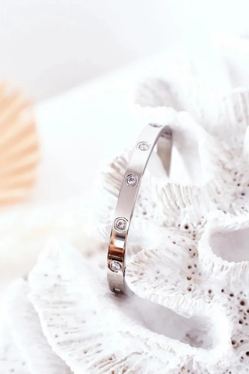 Bransoletka wykonana jest ze stali nierdzewnej, ozdobiona mieniącymi się cyrkoniami.