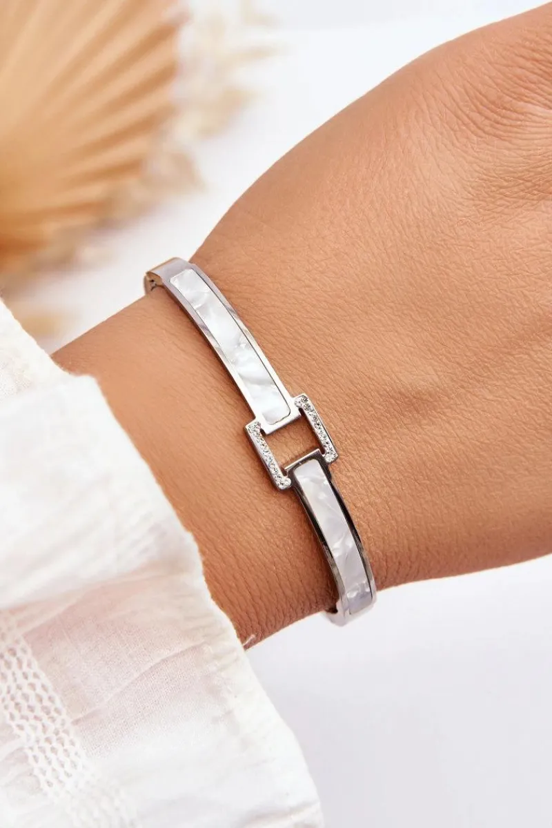 Sztywna, damska bransoletka została wykonana ze stali nierdzewnej. Model ten ozdobiono dżetami imitującymi cyrkonie oraz perłowym wzorkiem. Bransoletka będzie idealnie prezentować się jako dodatek do eleganckich stylizacji. Jest odpinana, jednak nie posiada możliwości regulacji długości.
