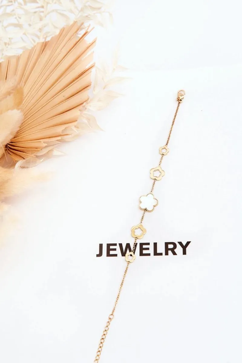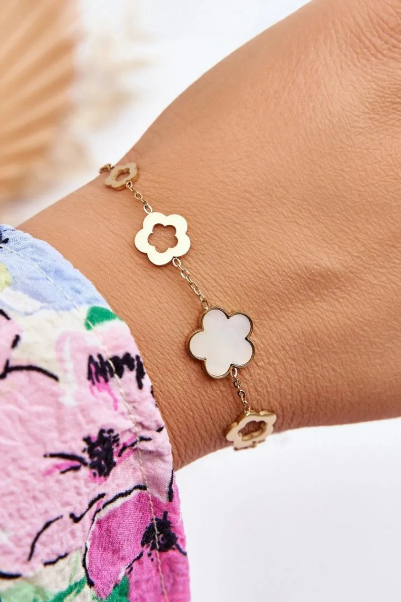 Klasyczna bransoletka na cienkim łańcuszku została wykonana ze stali nierdzewnej. Model ten posiada zawieszki w kształcie kwiatów. Bransoletka posiada regulację długości oraz jest zapinana na karabińczyk. Świetnie sprawdzi się do codziennych stylizacji.