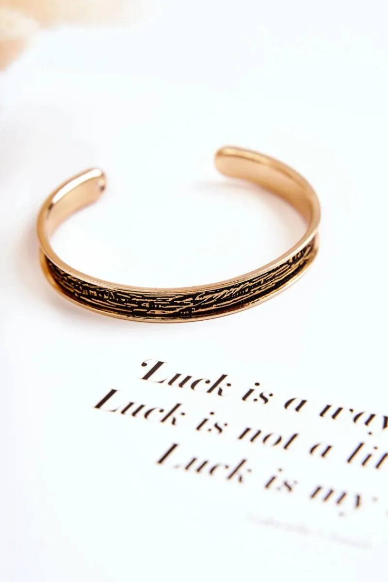 Każda stylizacja powinna być wzbogacona o dodatki w postaci biżuterii. Wspaniała bransoletka została wykonana z metalu z tłoczeniem. Jest to model wsuwany, który nie posiada zapięcia, przez co jej zakładanie będzie jeszcze łatwiejsze. Model ten idealnie sprawdzi się zarówno do eleganckich, jak i casualowych stylizacji. Sprawdź całą naszą kolekcję biżuterii i wybierz swój ulubiony dodatek.