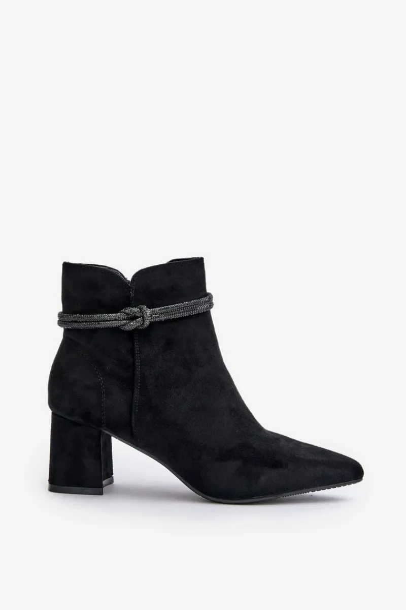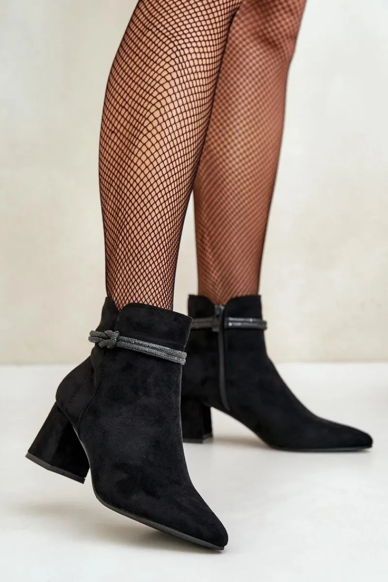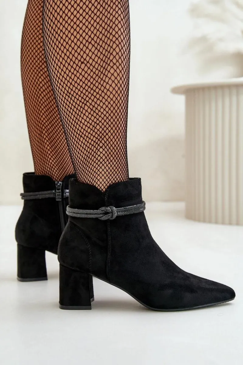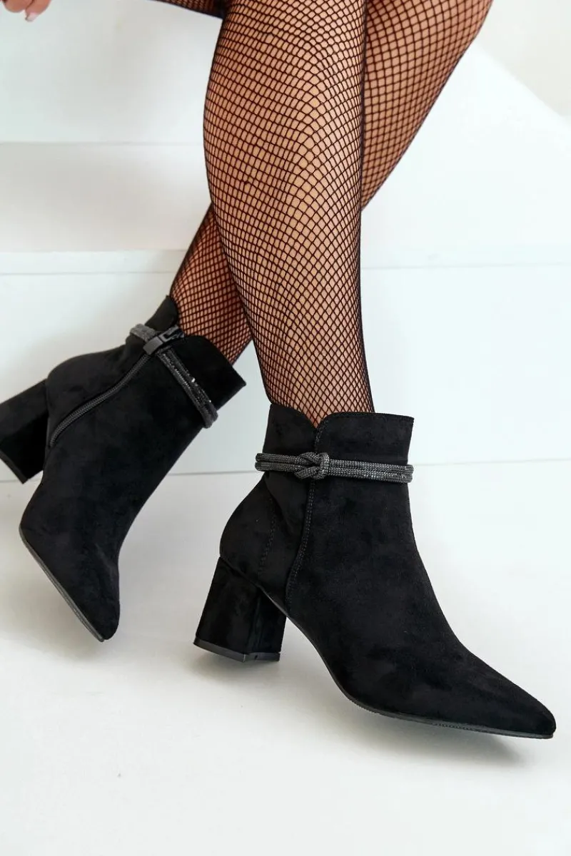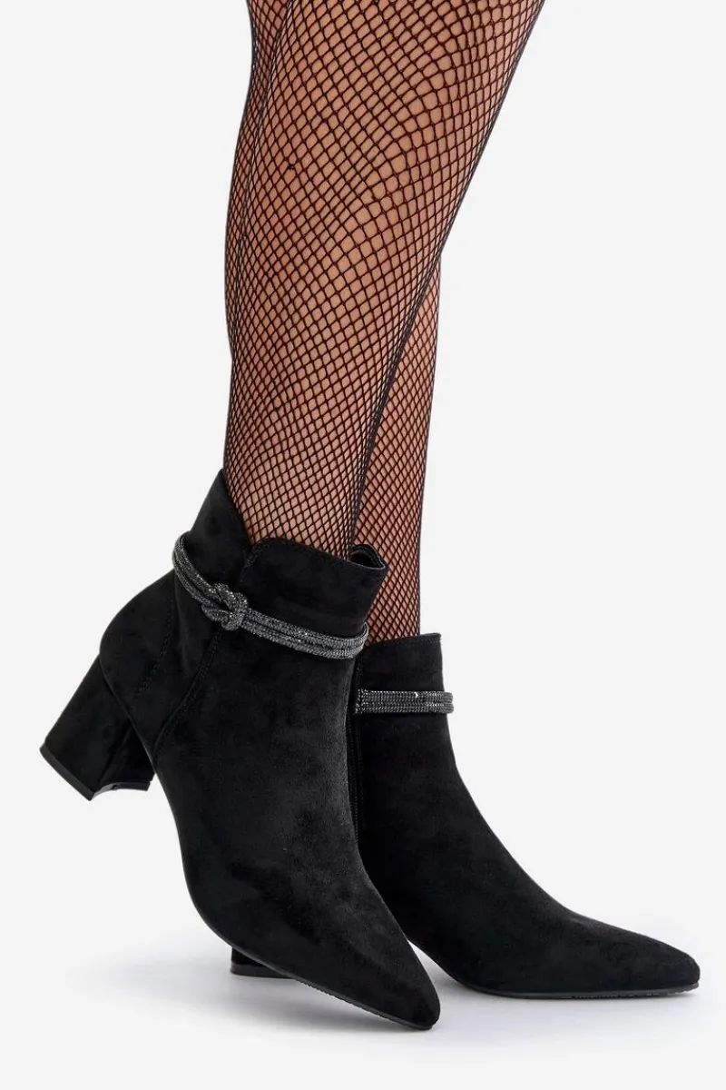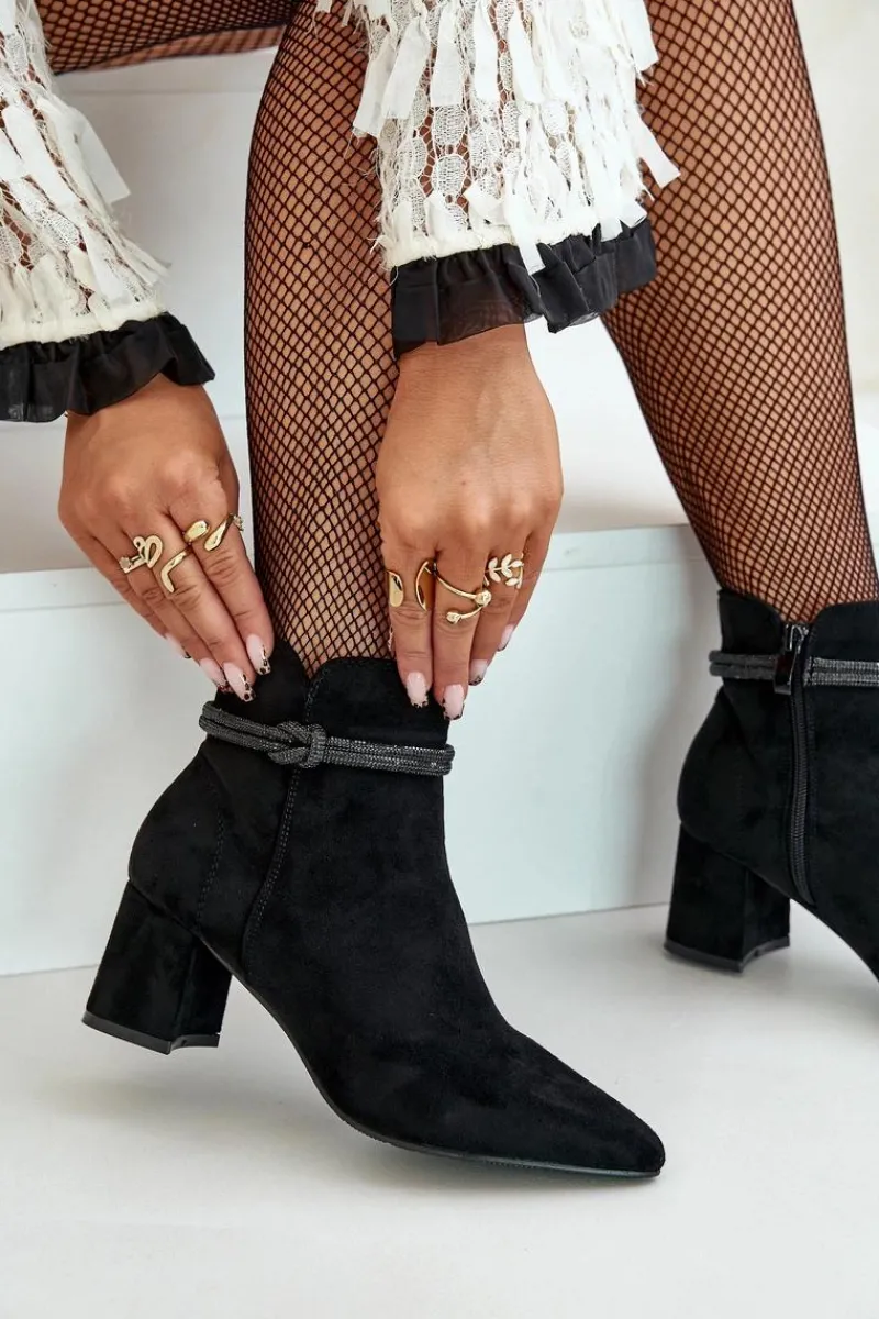 Botki damskie z cholewką sięgającą za kostkę. Wykonane z miłego w dotyku eko zamszu. Osadzone na obcasie w formie słupka. Cholewka ozdobiona błyszczącym paseczkiem. Noski w szpic optycznie wysmuklą nogi. Zapięcie na zamek gwarantuje łatwe zakładanie i zdejmowanie butów, co jest szczególnie praktyczne w codziennym użytkowaniu. Przy wyborze rozmiaru prosimy sugerować się tabelą rozmiarów.