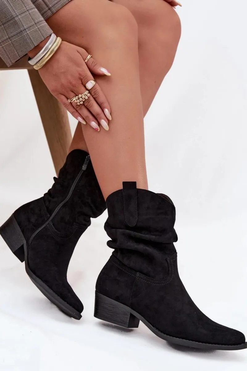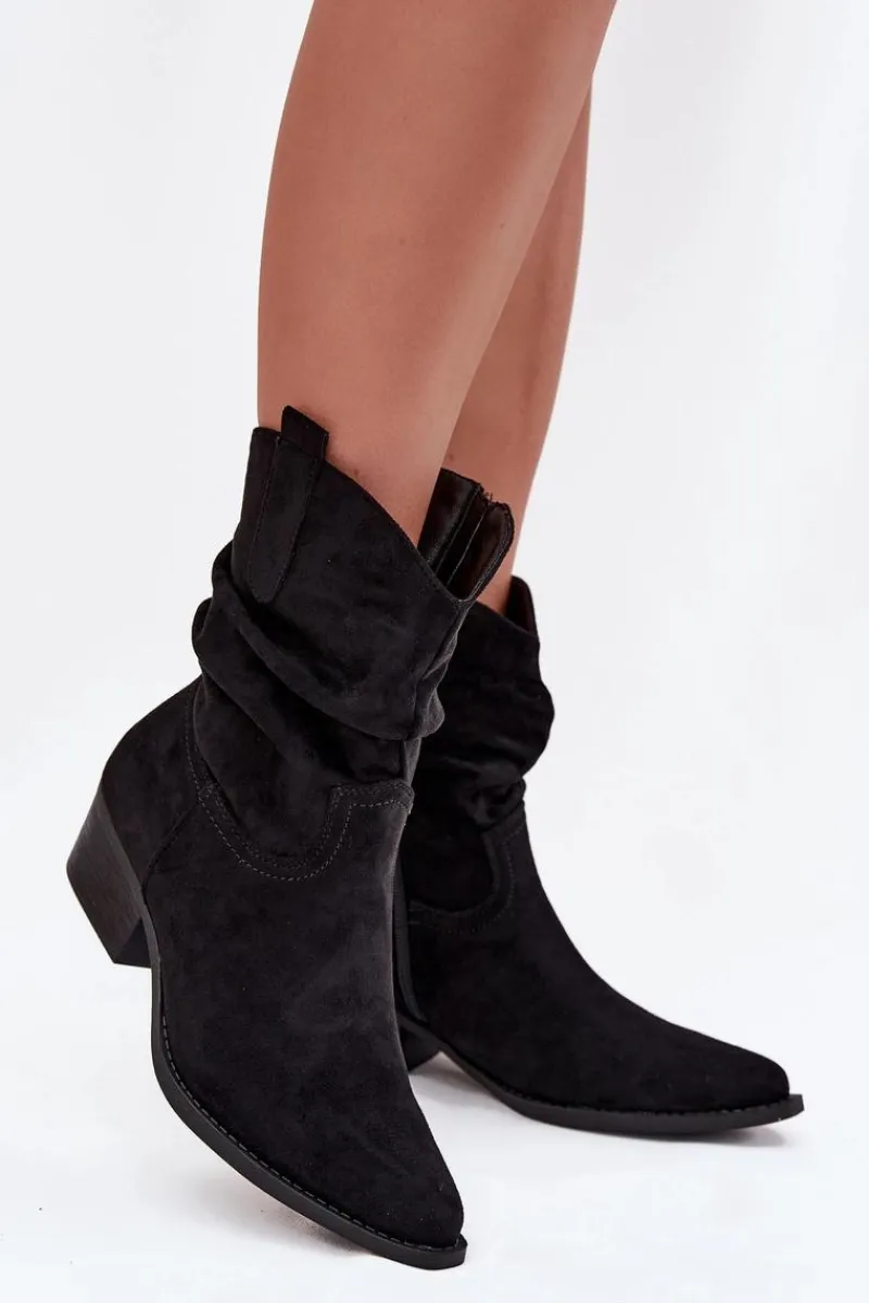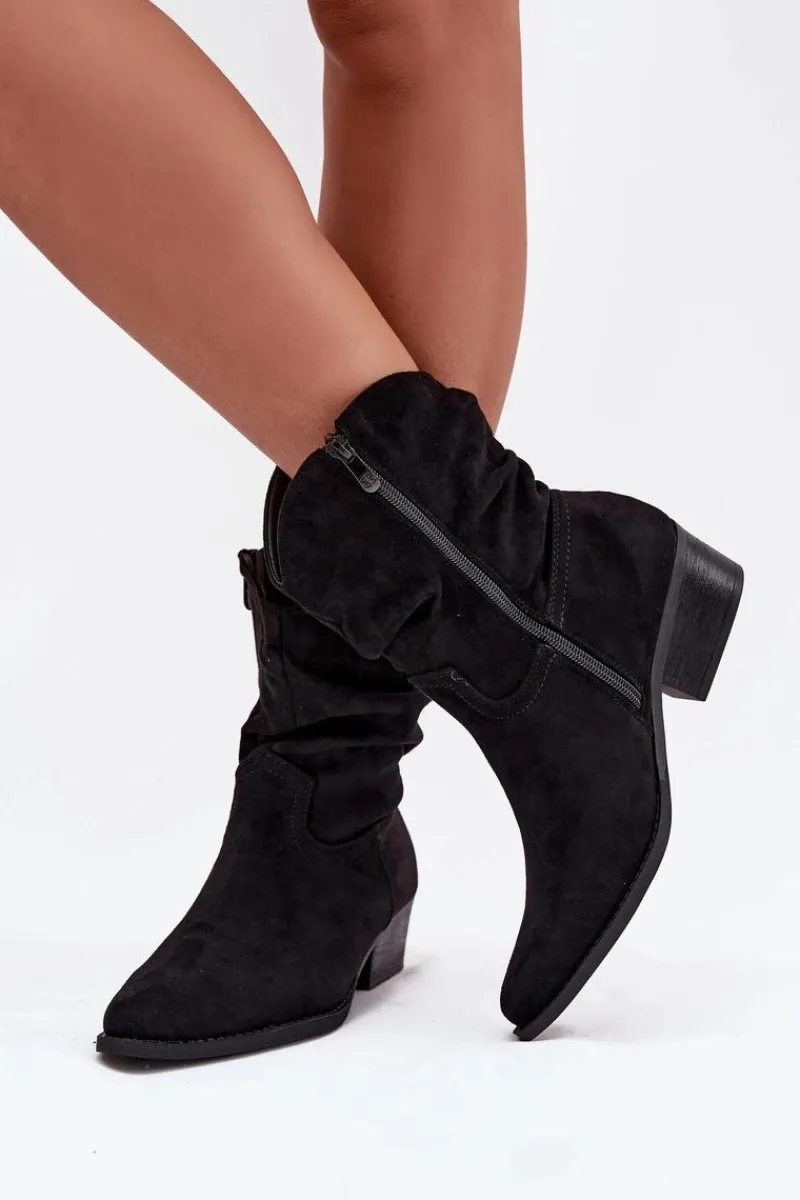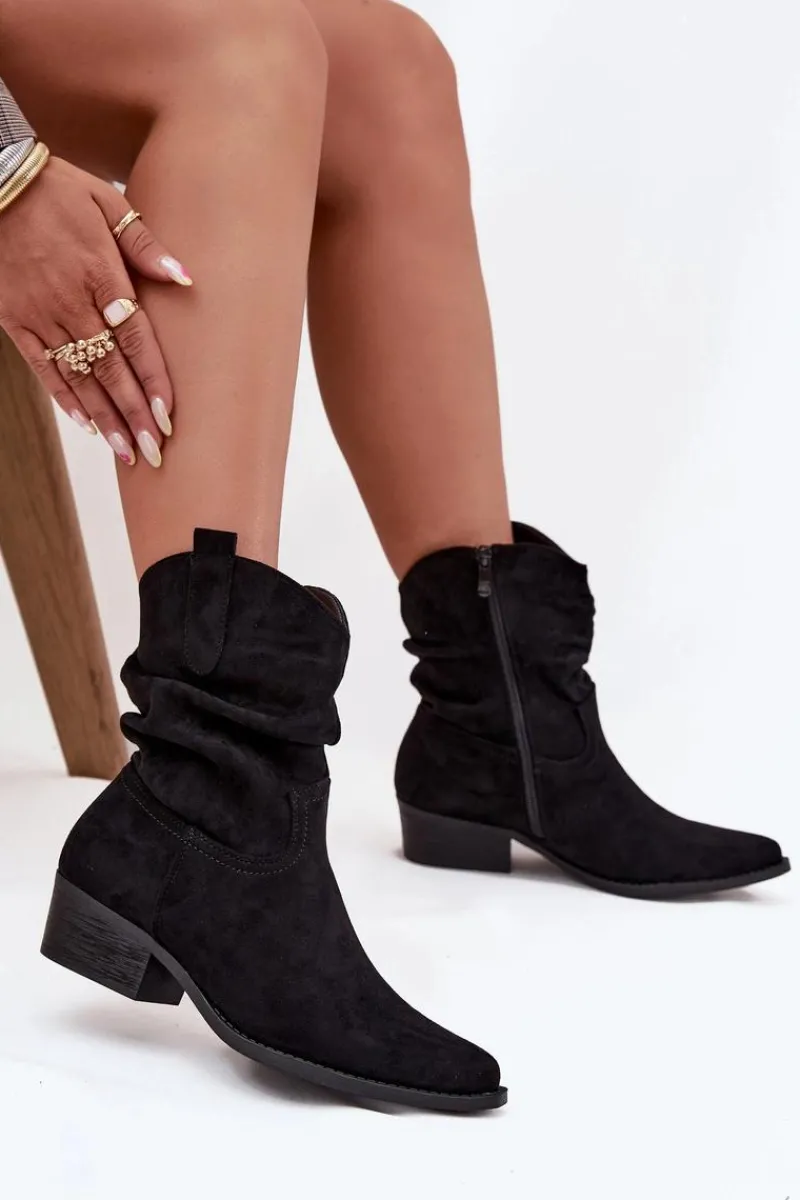 Botki damskie wykonane z eko zamszu. Osadzone na niskim obcasie w formie klocka, zapewniają stabilność i komfort przez cały dzień. Noski w kształcie migdała dodają im subtelności, a zamek błyskawiczny ułatwia zakładanie. Wyróżniają się oryginalną cholewką z marszczeniem, które nadaje im wyjątkowego charakteru. Te botki idealnie komponują się zarówno z codziennymi, jak i bardziej formalnymi stylizacjami. Przy wyborze rozmiaru prosimy sugerować się tabelą rozmiarów.