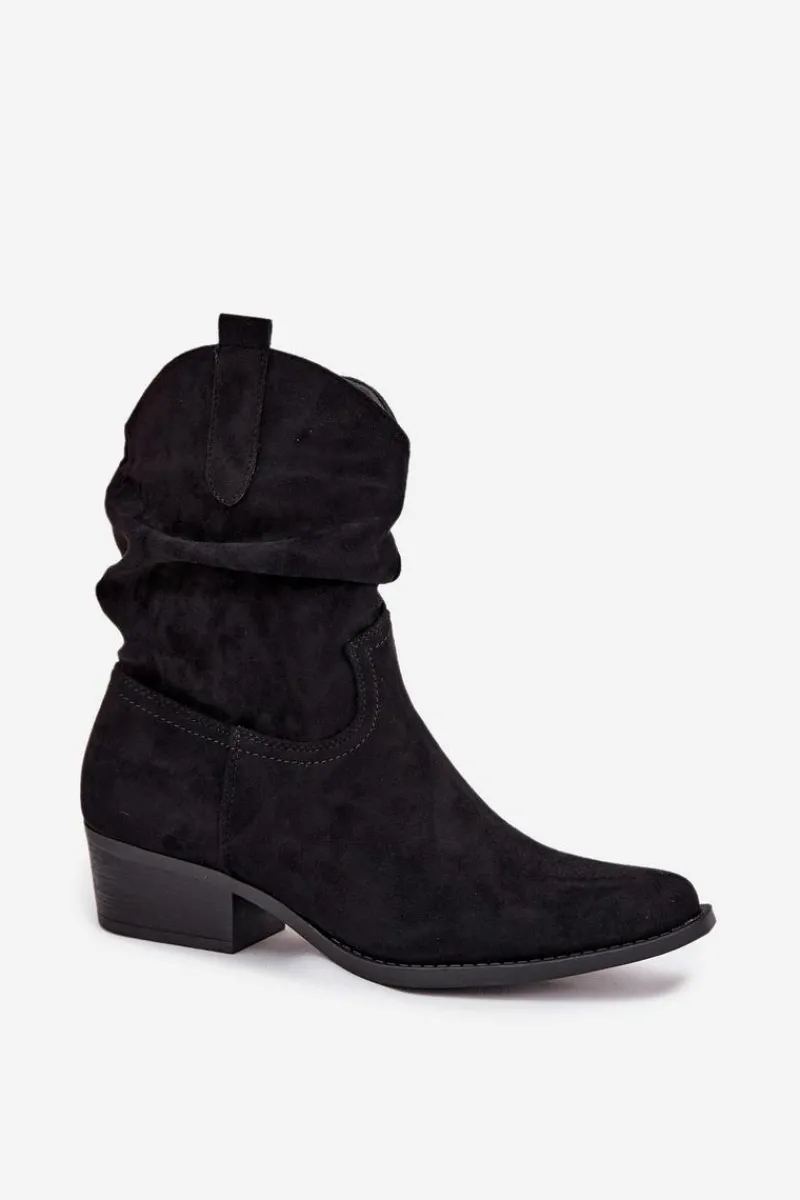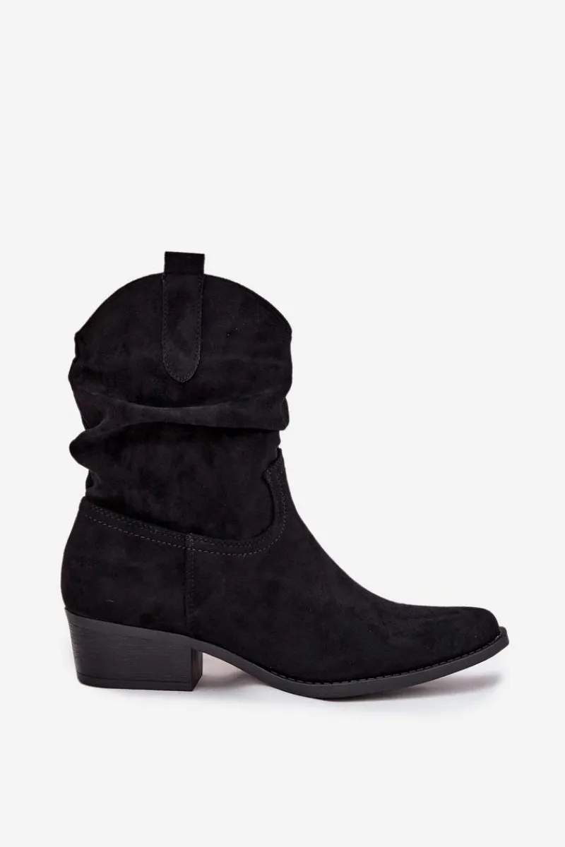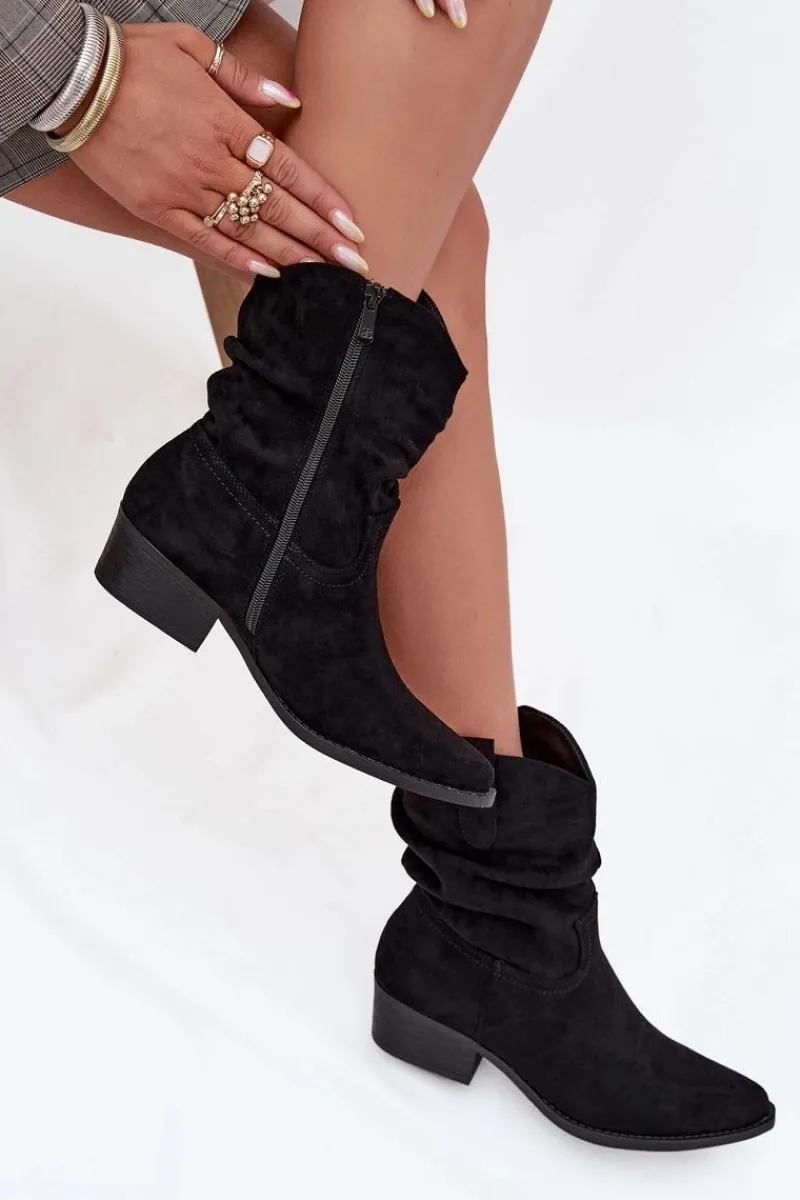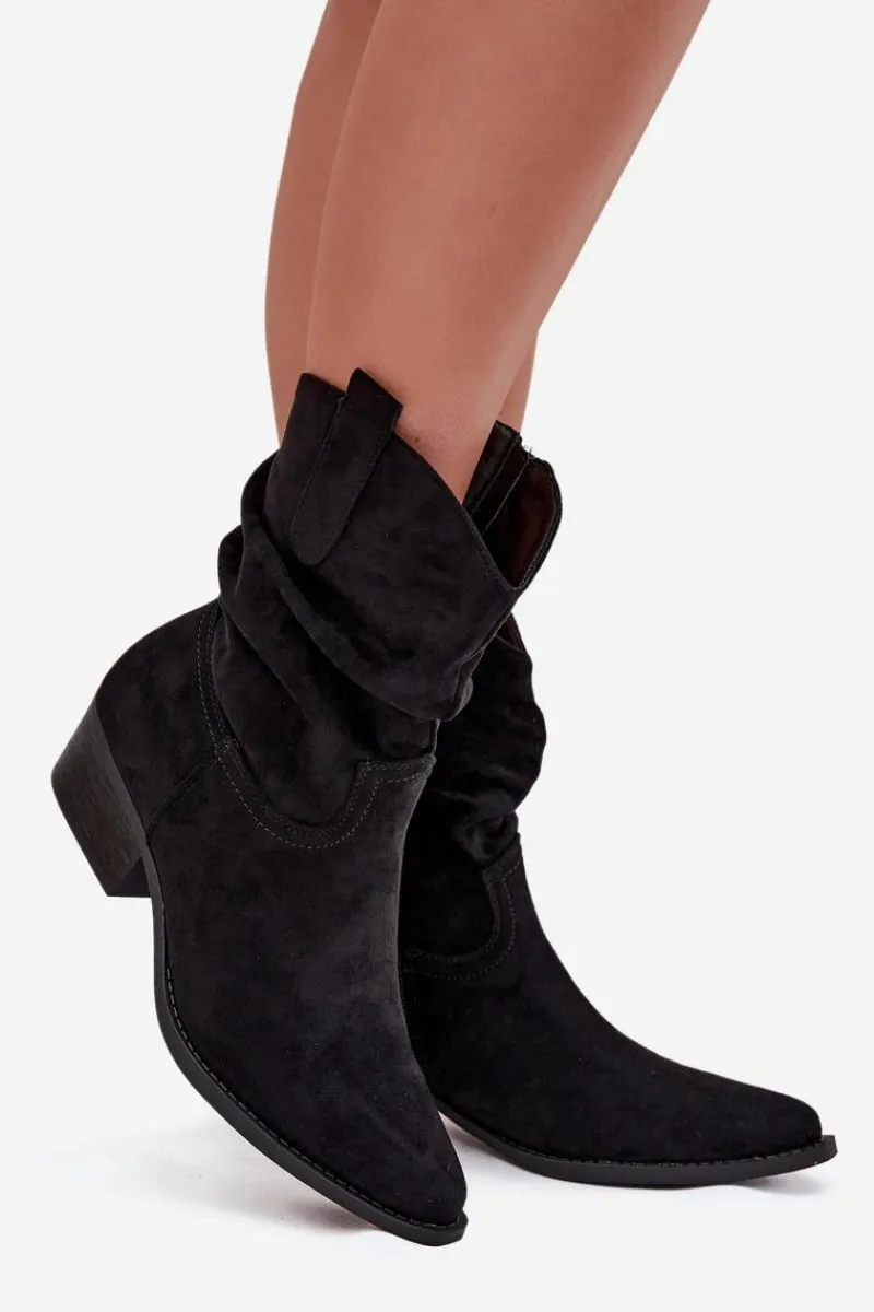 Botki damskie wykonane z eko zamszu. Osadzone na niskim obcasie w formie klocka, zapewniają stabilność i komfort przez cały dzień. Noski w kształcie migdała dodają im subtelności, a zamek błyskawiczny ułatwia zakładanie. Wyróżniają się oryginalną cholewką z marszczeniem, które nadaje im wyjątkowego charakteru. Te botki idealnie komponują się zarówno z codziennymi, jak i bardziej formalnymi stylizacjami. Przy wyborze rozmiaru prosimy sugerować się tabelą rozmiarów.