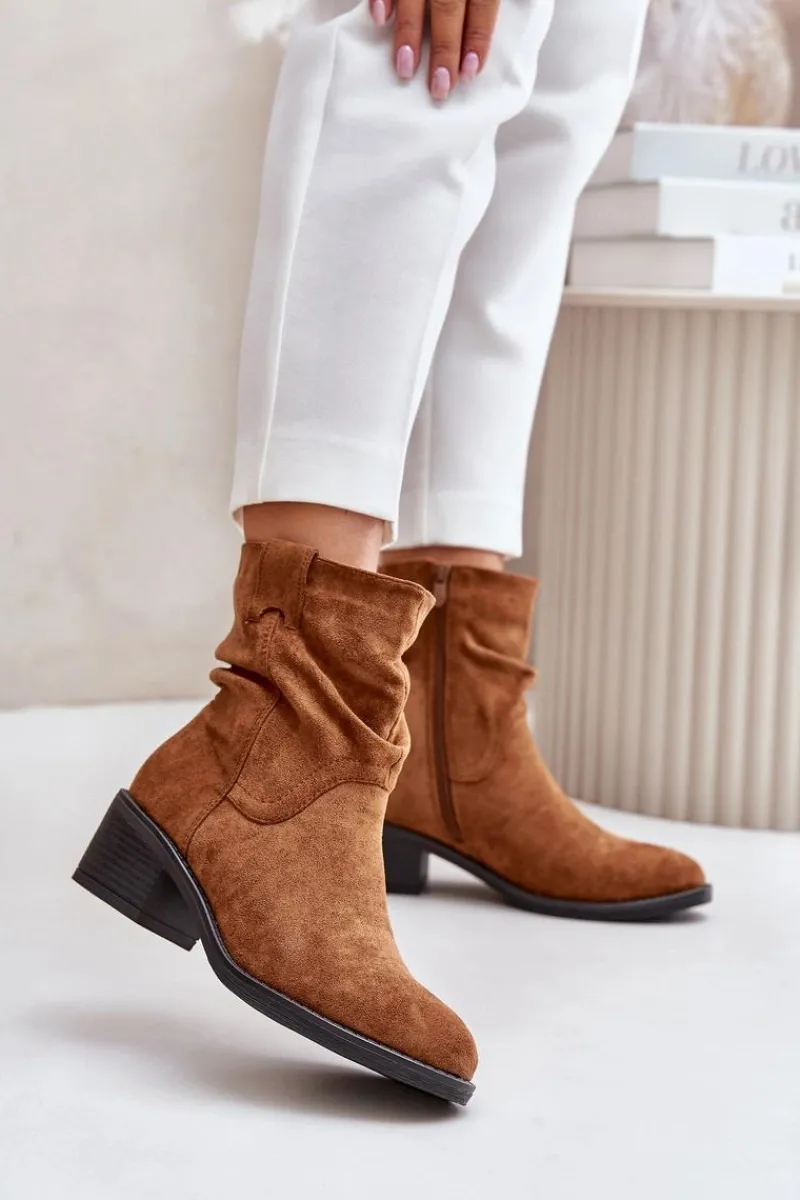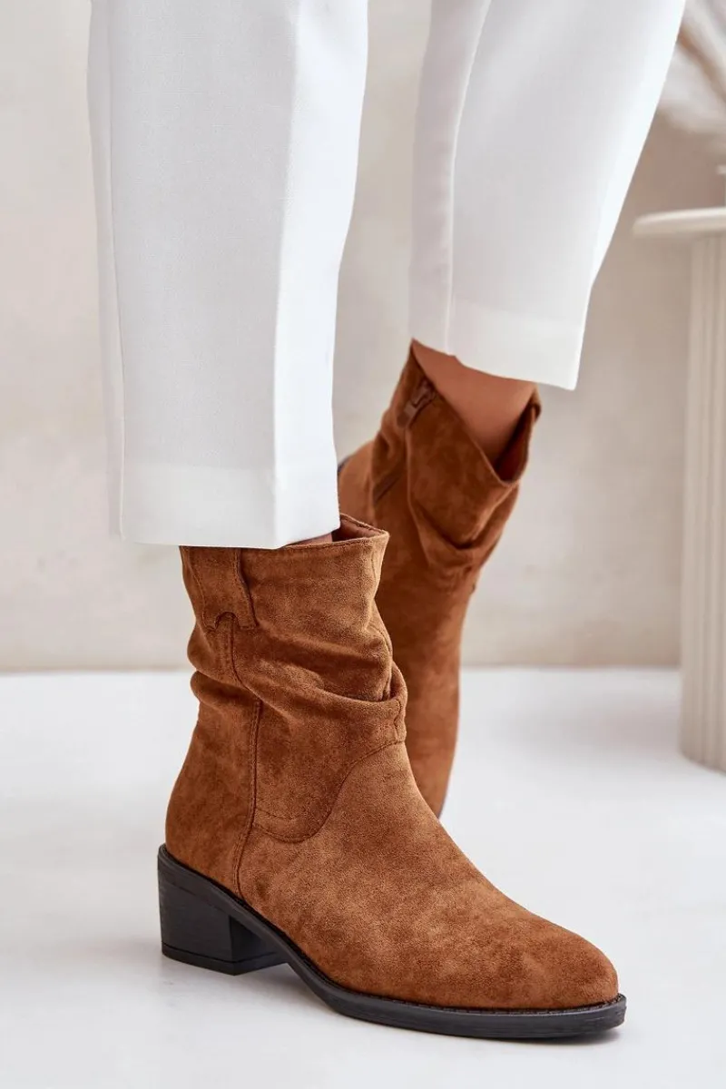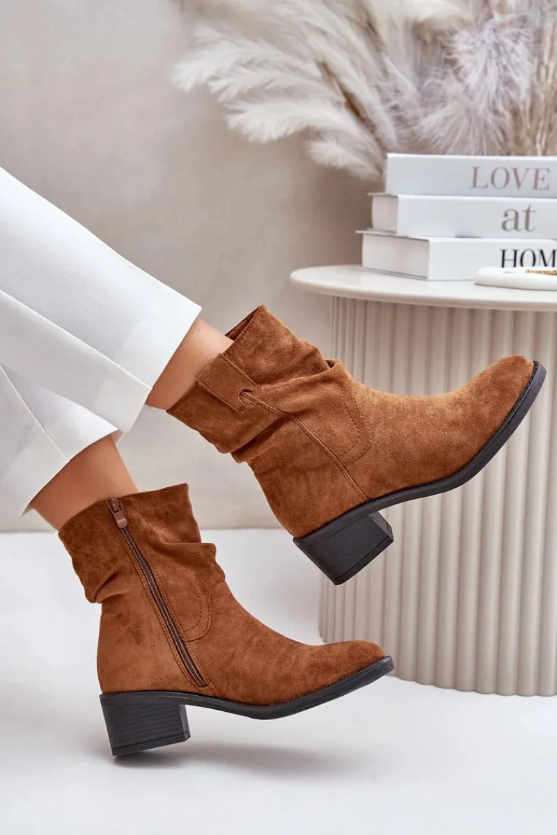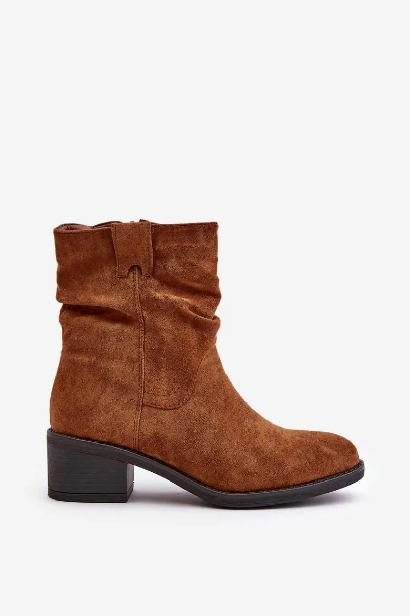 Klasyczne damskie botki wykonane z eko zamszu. Osadzone na niskim, stabilnym obcasie. Noski zaokrąglone. Zapinane na zamek. Model ten wyróżnia się marszczeniami na cholewce. Środek ocieplany kocem obuwniczym, co zapewni ciepło w chłodniejsze dni. Przy wyborze rozmiaru prosimy sugerować się tabelą rozmiarów.