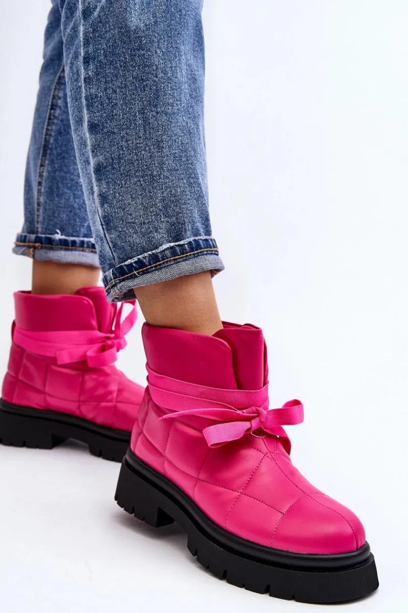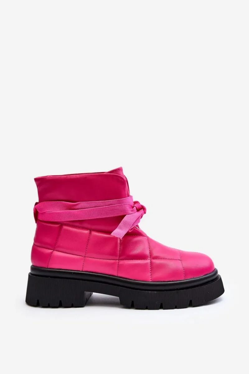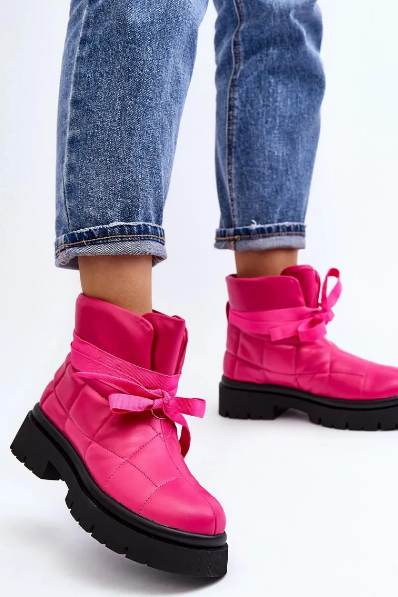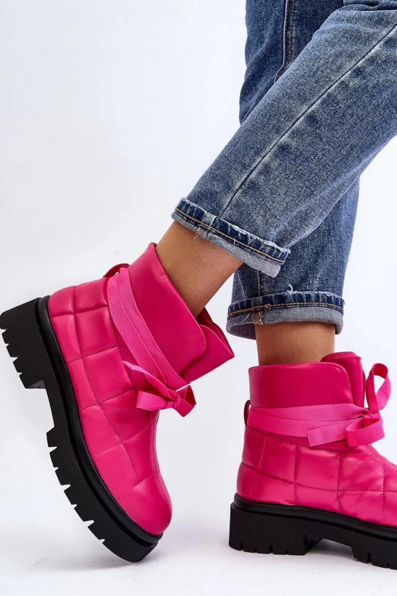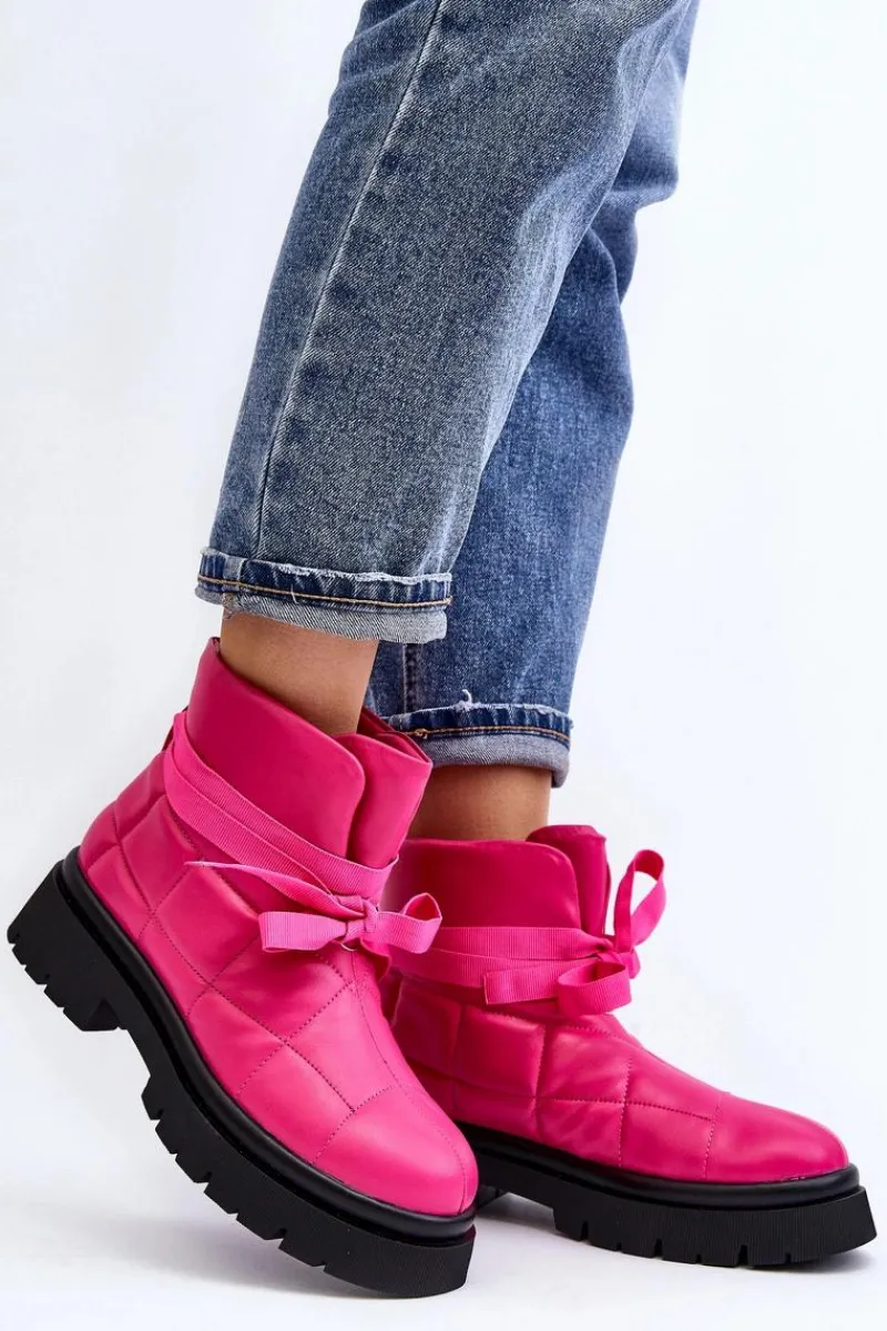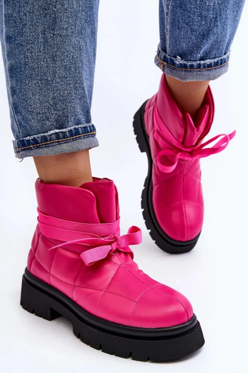 Ciepłe i modne botki wykonane z eko skóry. Osadzone na płaskim, stabilnym obcasie. Model wsuwany, z cholewką za kostkę. Środek ocieplony futerkiem. Cholewka ozdobiona pikowaniem. Dodatkowo zapiętek jest usztywniony. Idealne na chłodne dni! Przy wyborze rozmiaru prosimy sugerować się tabelą rozmiarów.