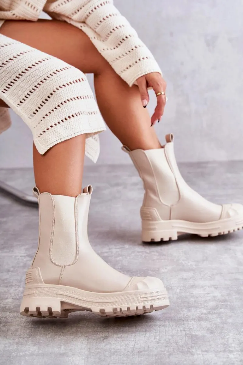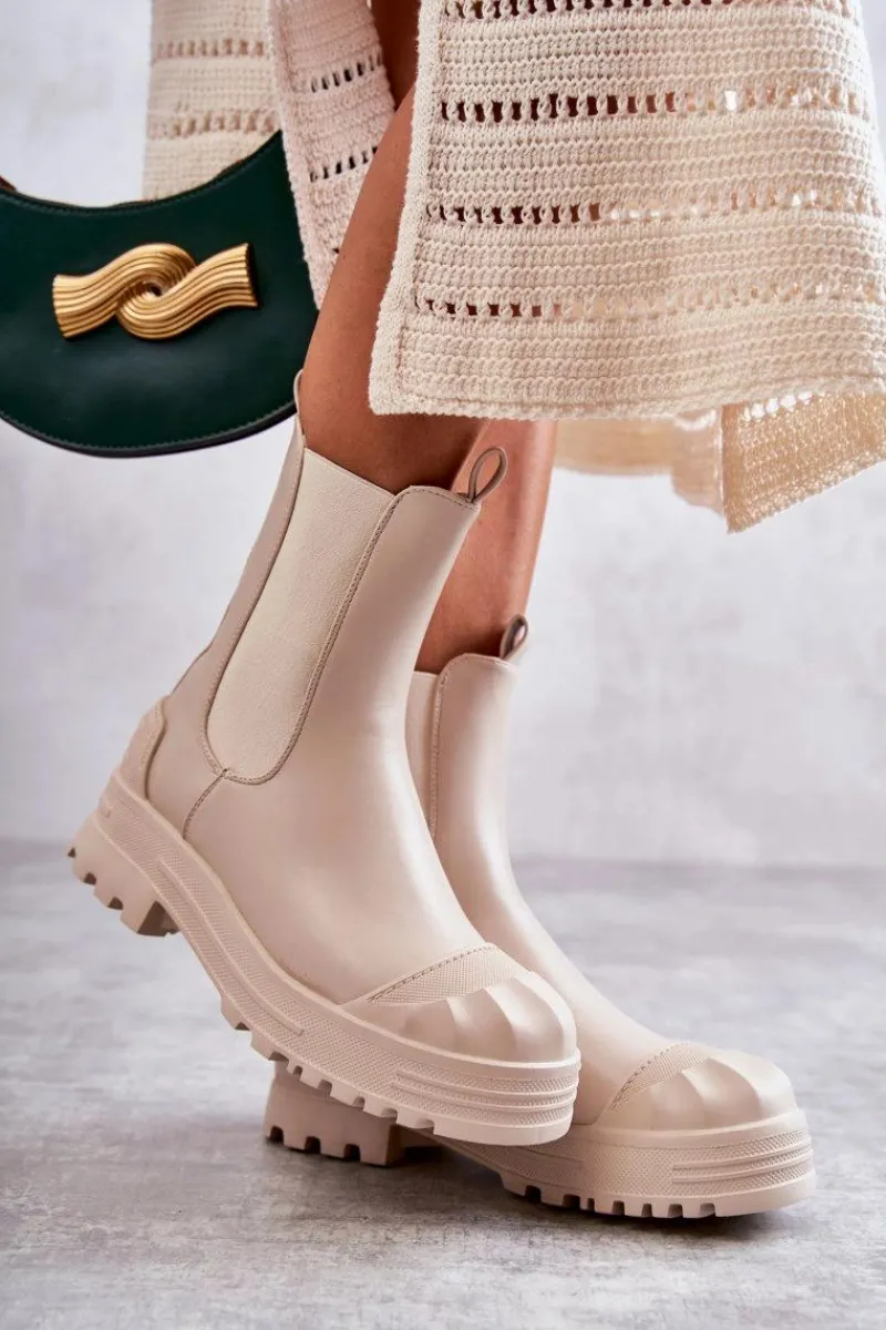 Niezwykłe i stylowe botki damskie zostały wykonane z eko skóry. Model wsuwany. Zapiętek został usztywniony. Na okrągłym nosku znajduje się charakterystyczne wzmocnienie z tworzywa sztucznego. Botki osadzone są na platformie oraz płaskim obcasie. Wkładka materiałowa. Dodatkowo u góry cholewki znajdują się pętelki ułatwiające zakładanie obuwia. Przy wyborze rozmiaru prosimy sugerować się tabelą rozmiarów.