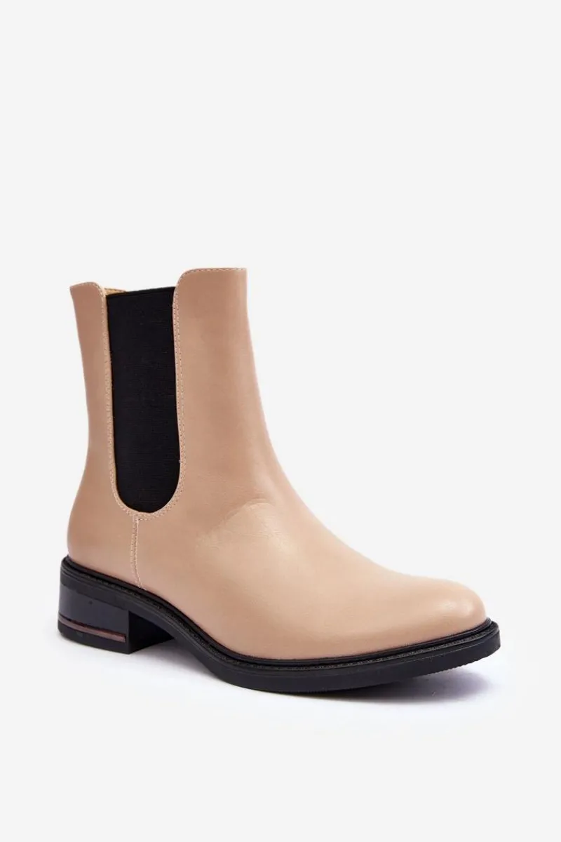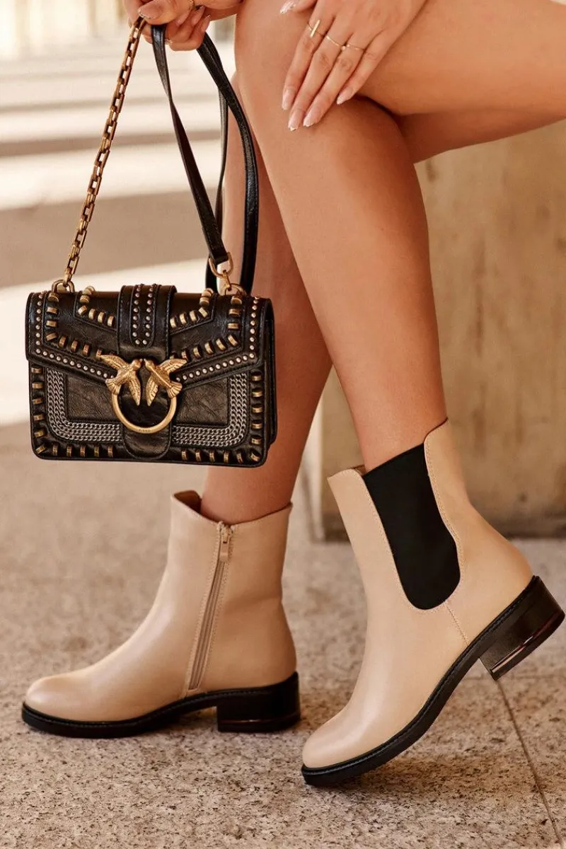 Klasyczne botki damskie z cholewką za kostkę. Osadzone na płaskim, stabilnym obcasie. Model wykonany z eko skóry. Idealne do jesiennych stylizacji! Przy wyborze rozmiaru prosimy sugerować się tabelą rozmiarów.