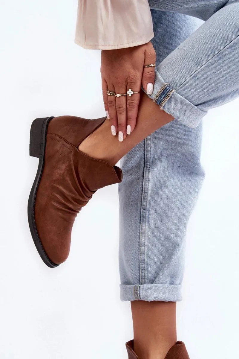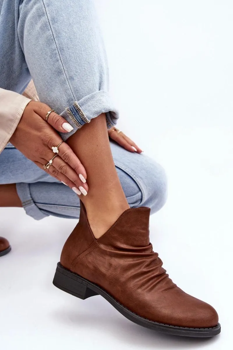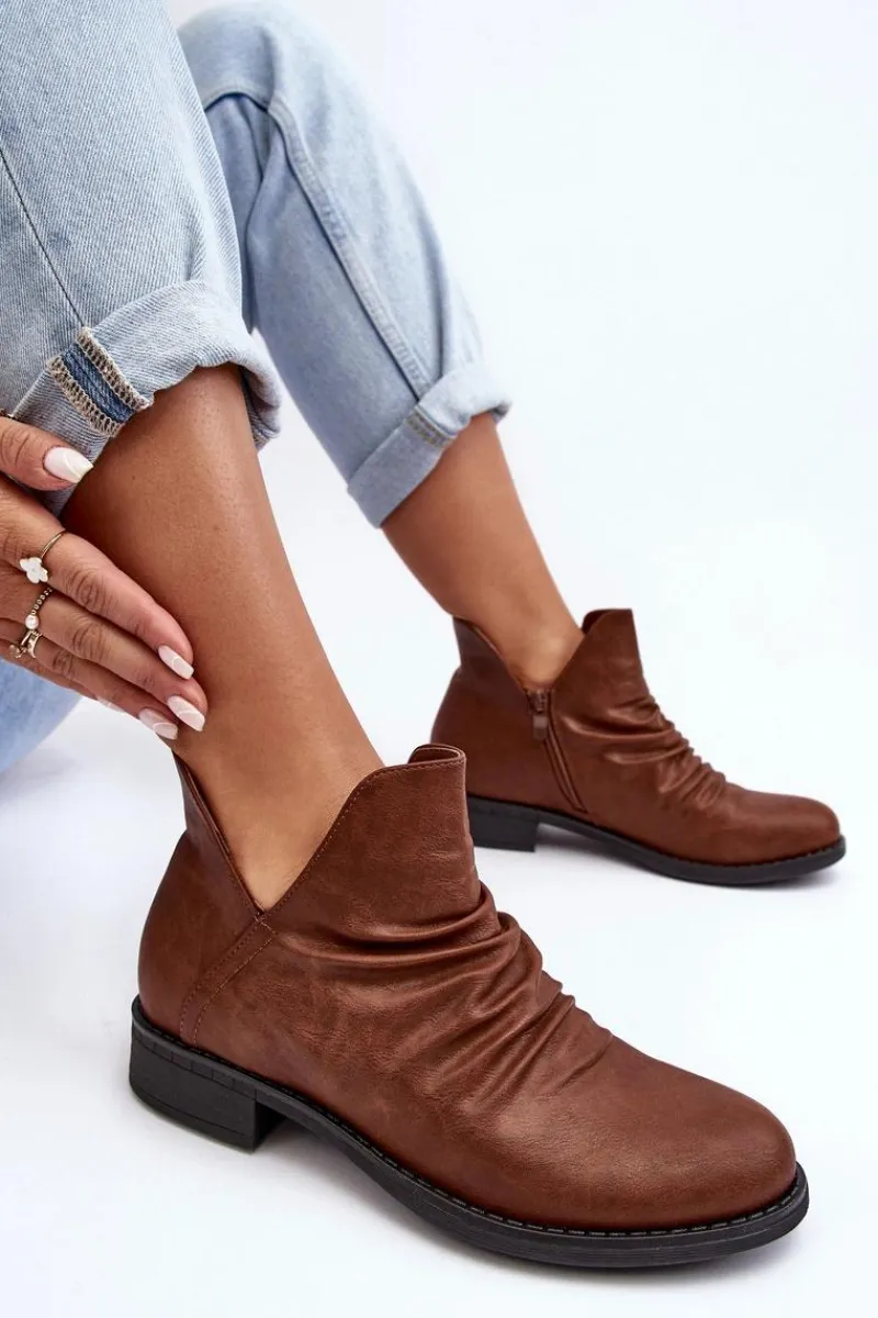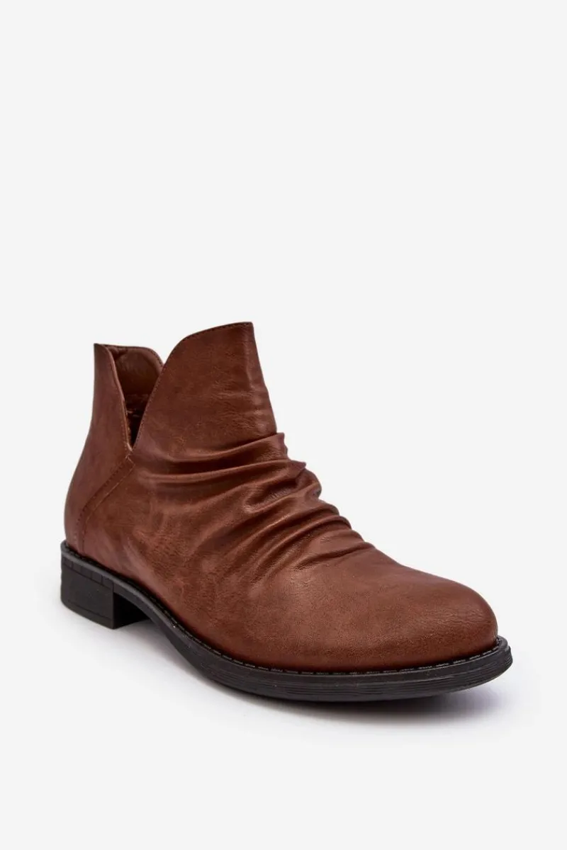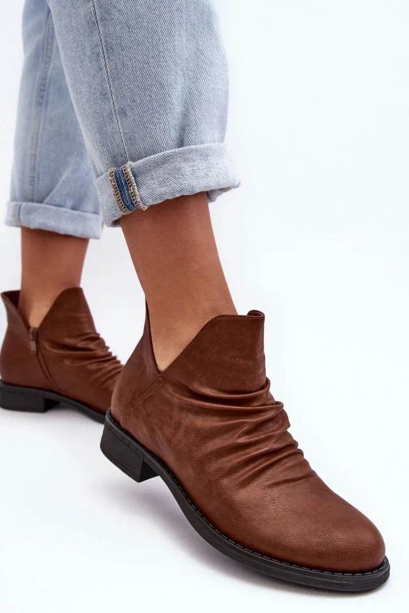 Niskie botki damskie wykonane z eko skóry. Osadzone na płaskim, stabilnym obcasie. Cholewka z wycięciami na bokach. Z przodu marszczenie. Środek ocieplony kocem obuwniczym. Noski zaokrąglone. Model ten zapinany jest na suwak z boku. Przy wyborze rozmiaru prosimy sugerować się tabelą rozmiarów.