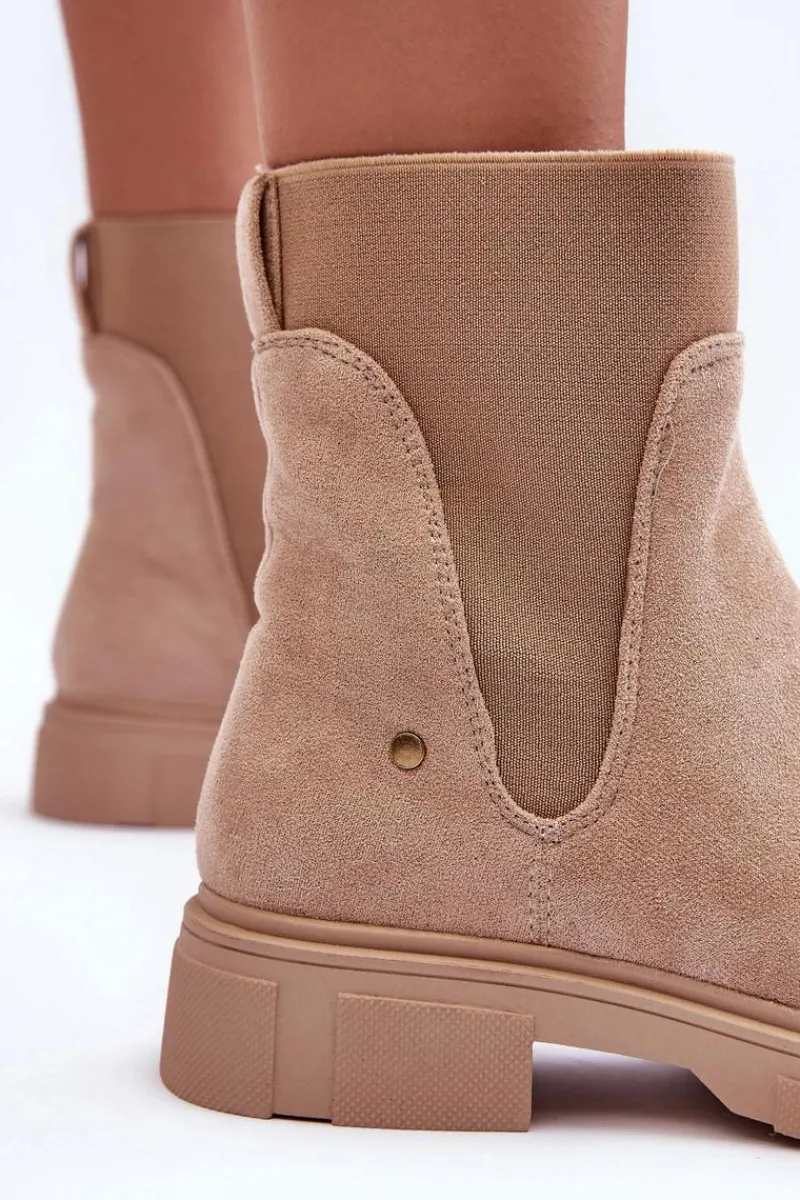 Damskie botki zostały wykonane z miłego w dotyku eko zamszu. Osadzono je na platformie i płaskim obcasie. Model ten posiada elastyczne wstawki na cholewce. Nie czekaj aż znikną i kup już dziś! Przy wyborze rozmiaru prosimy sugerować się tabelą rozmiarów.