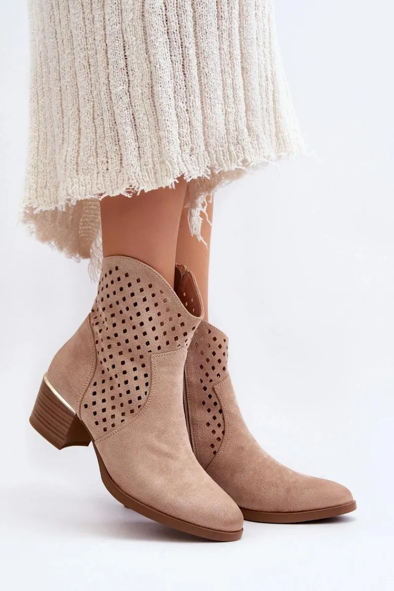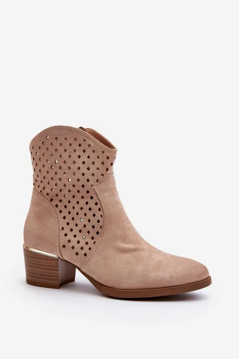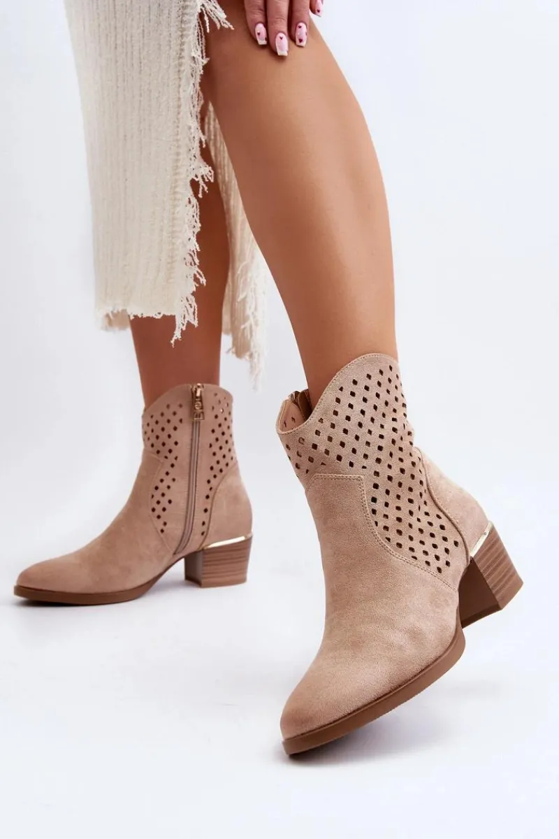 Z tymi botkami idealnie przygotujesz się na nadchodzący sezon! Eko zamszowa cholewka w ażurowy wzorek charakteryzuje ten model. Niski obcas zapewni stabilność na każdym kroku. Model ten zapinany jest na zamek. Noski w migdał. Fason ten idealnie dopełni wiosenne stylizacje! Przy wyborze rozmiaru prosimy sugerować się tabelą rozmiarów.