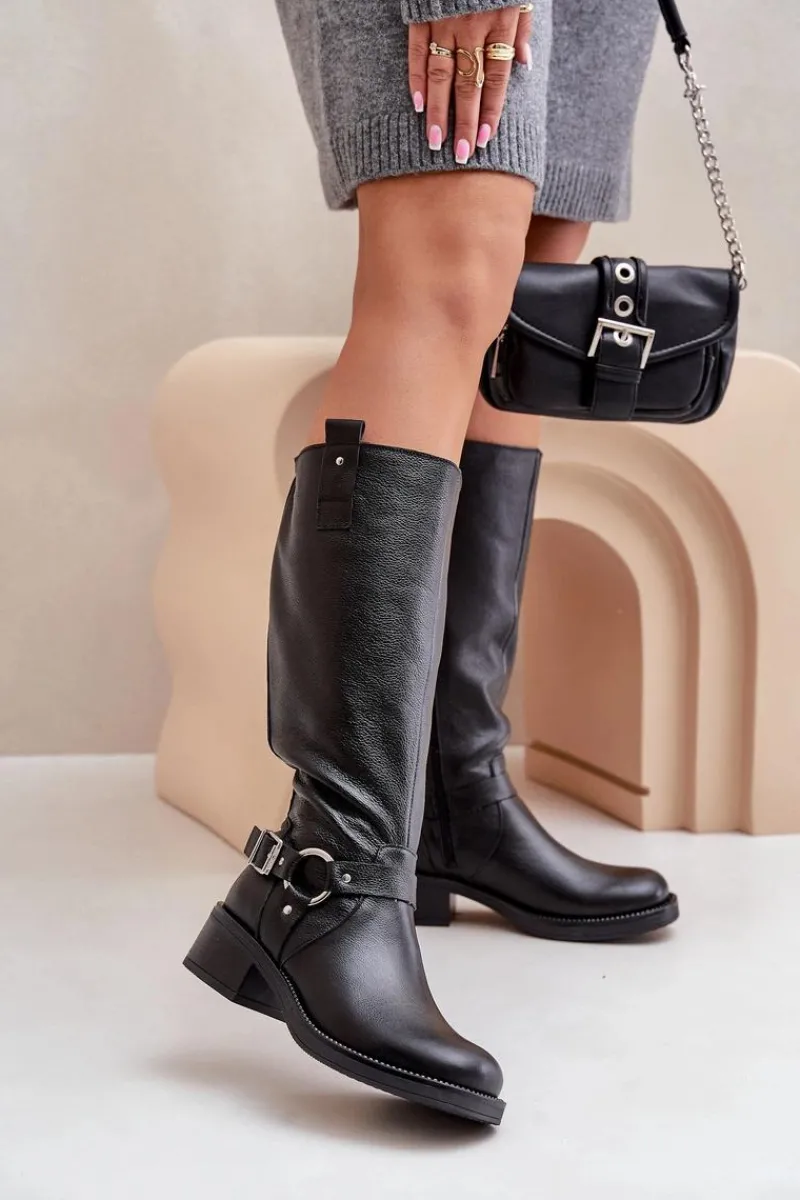 Damskie kozaki wykonane z naturalnej skóry. Cholewka, sięgająca przed kolano, dodaje elegancji i doskonale współgra z różnorodnymi stylizacjami. Subtelny wygląd zapewniają zaokrąglone noski. Model zapinany na zamek, co ułatwia zakładanie, a ozdobne paski na cholewce nadają im charakteru. Środek ocieplany filcem. Te idealne na co dzień i wyjątkowe wydarzenia kozaki będą świetnym uzupełnieniem Twojej garderoby! Przy wyborze rozmiaru prosimy sugerować się tabelą rozmiarów.