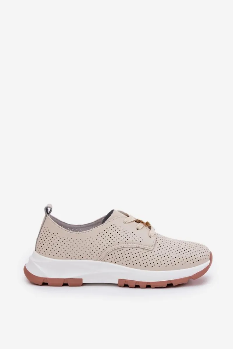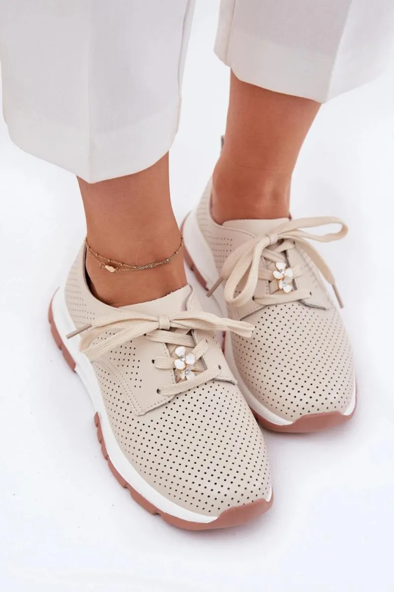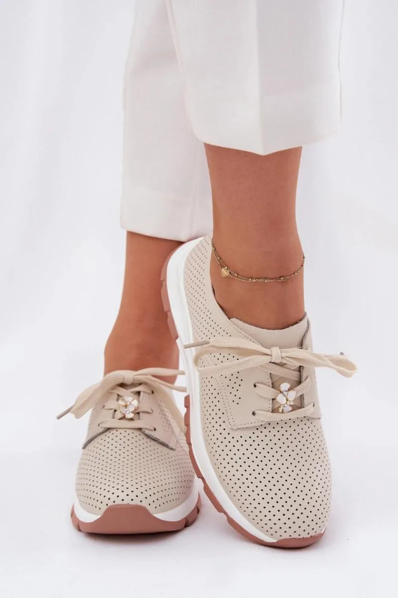 Półbuty damskie w sportowym stylu wykonane z naturalnej skóry to połączenie komfortu i modnego wyglądu. Osadzone na platformie, zapewniają lekkość i wygodę przez cały dzień. Sznurowanie ozdobione przypinką w kształcie kwiatuszków dodaje im urokliwego akcentu, a zaokrąglone noski gwarantują pełną swobodę ruchu. Skórzana wkładka dba o komfort stóp, czyniąc te półbuty doskonałym wyborem na co dzień. Przy wyborze rozmiaru prosimy sugerować się tabelą rozmiarów.