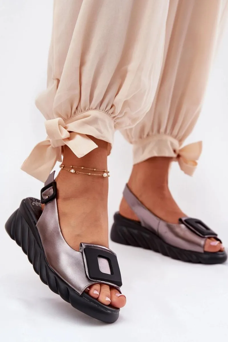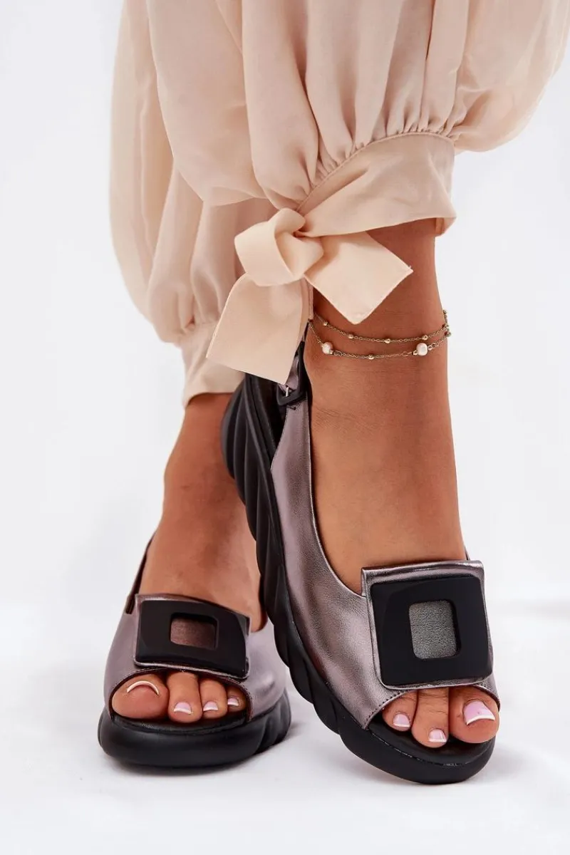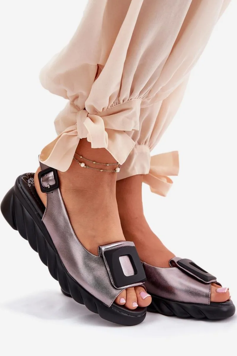 Damskie sandały z naturalnej skóry, osadzone na koturnie, to elegancki wybór na ciepłe dni. Model wyróżnia się ozdobą z przodu, która nadaje im wyjątkowego charakteru. Zapinane na klamrę z regulowanym paskiem, zapewniają idealne dopasowanie do stopy. Dodatkowo miękka wkładka gwarantuje komfort przez cały dzień. Te sandały będą doskonałym wyborem do letnich stylizacji, łącząc elegancję z wygodą. Przy wyborze rozmiaru prosimy sugerować się tabelą rozmiarów.
