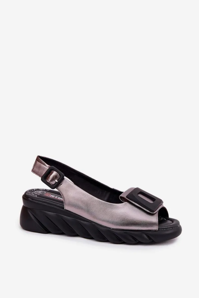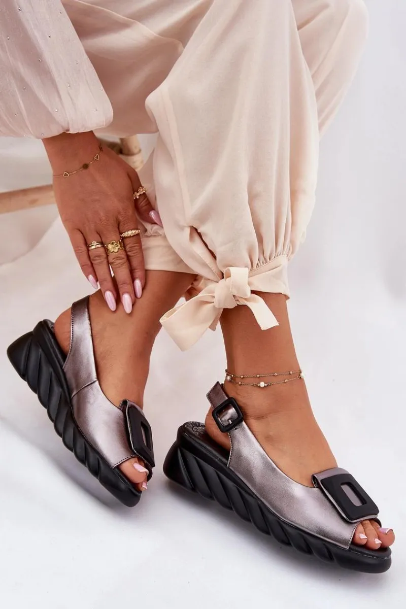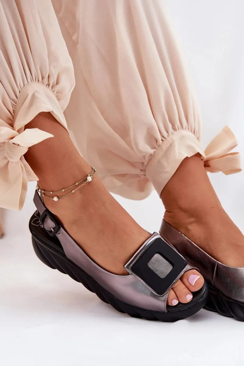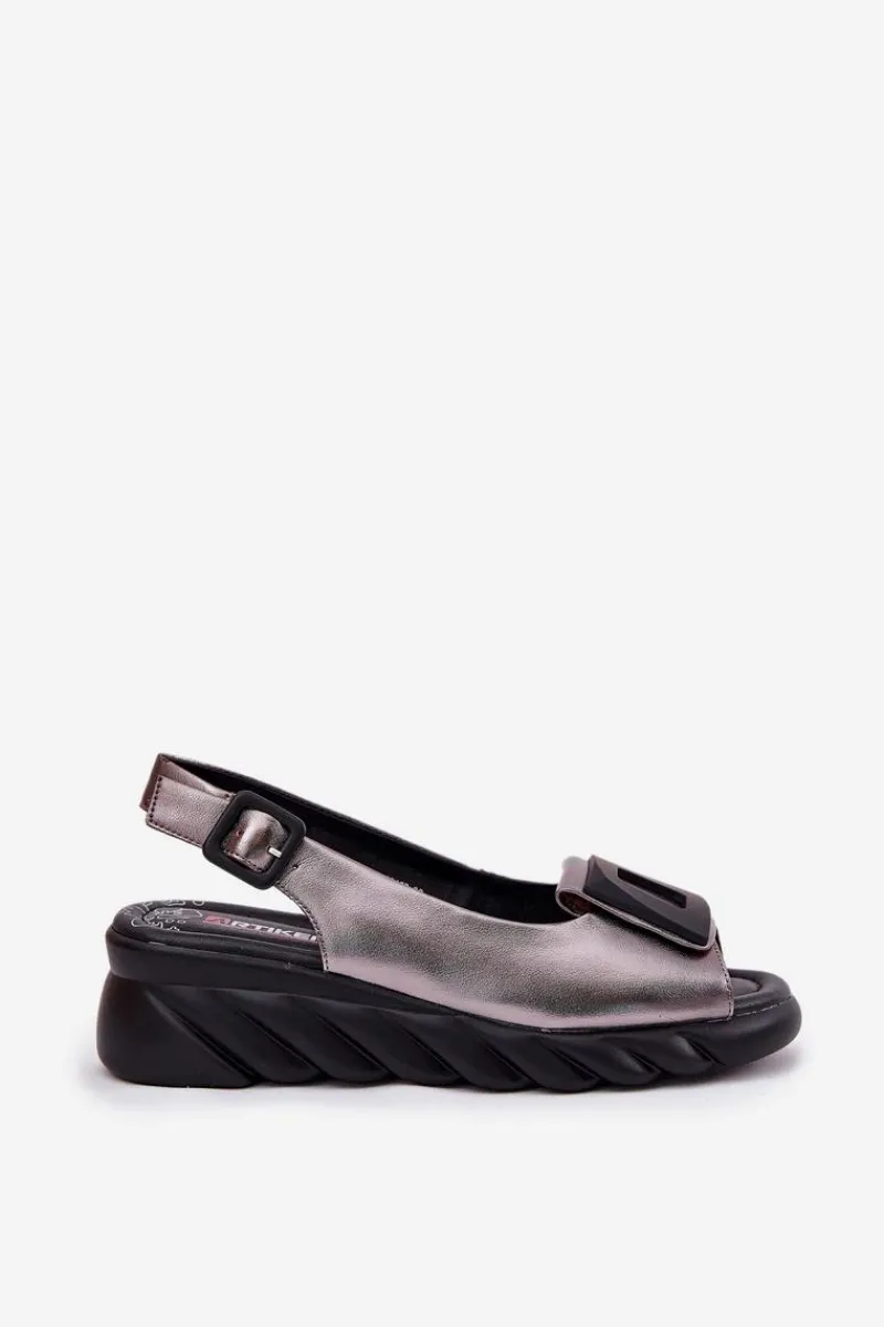 Damskie sandały z naturalnej skóry, osadzone na koturnie, to elegancki wybór na ciepłe dni. Model wyróżnia się ozdobą z przodu, która nadaje im wyjątkowego charakteru. Zapinane na klamrę z regulowanym paskiem, zapewniają idealne dopasowanie do stopy. Dodatkowo miękka wkładka gwarantuje komfort przez cały dzień. Te sandały będą doskonałym wyborem do letnich stylizacji, łącząc elegancję z wygodą. Przy wyborze rozmiaru prosimy sugerować się tabelą rozmiarów.