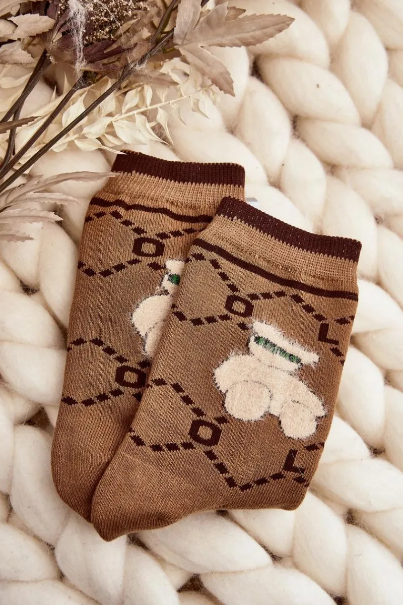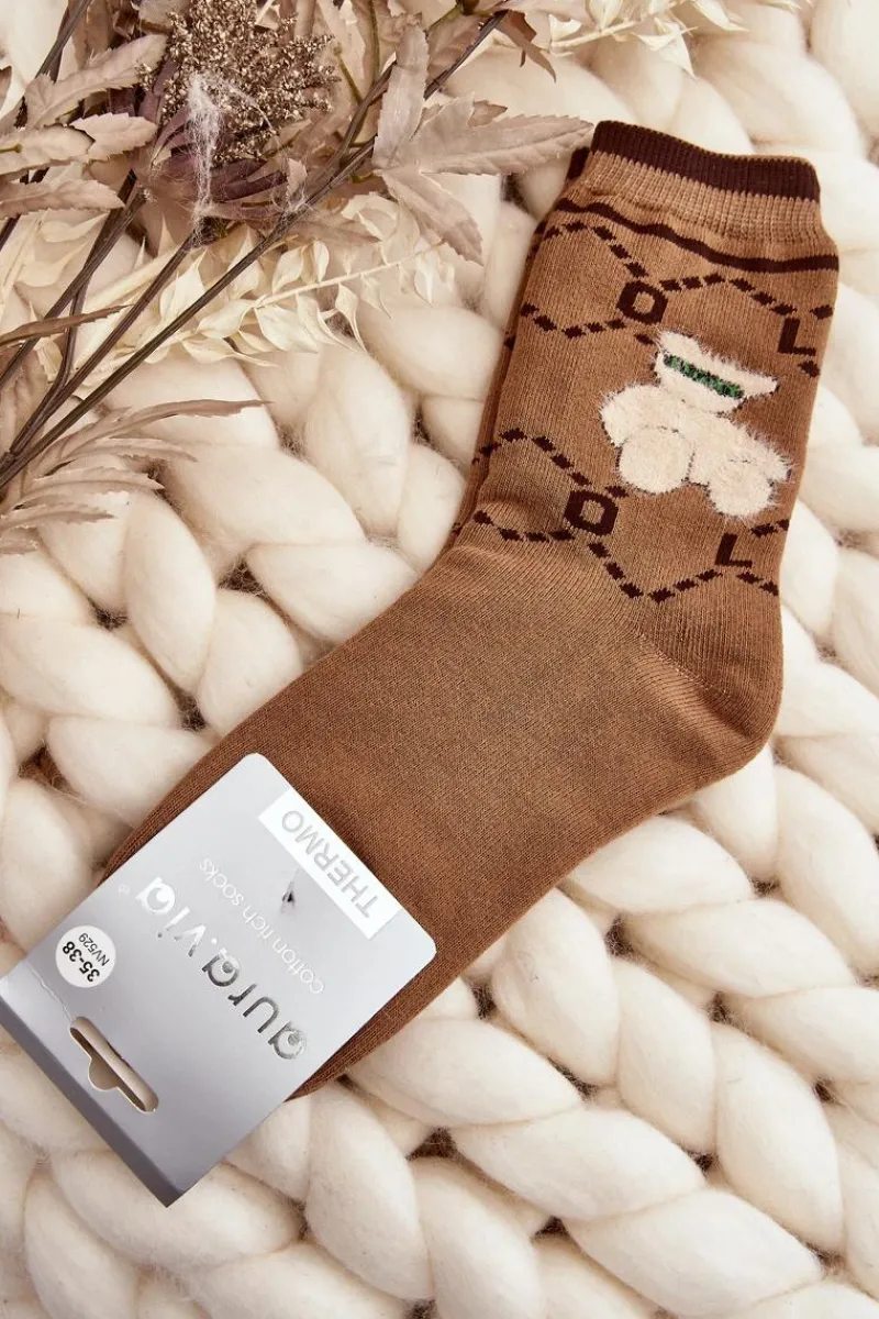Ciepłe skarpety damskie idealne na mroźne dni. Model z naszywką w postaci misia. Lekki ściągacz sprawi, że będą idealnie dopasowane do tęgości nogi. Koniecznie powinnaś je mieć!