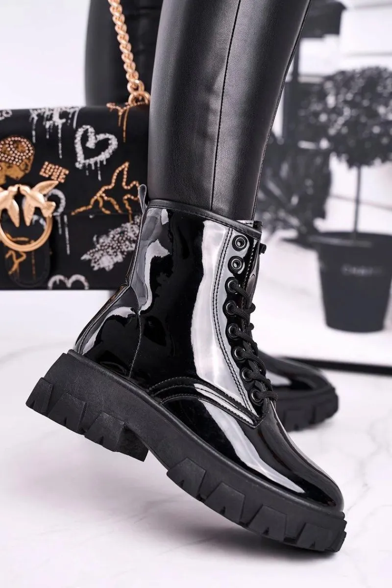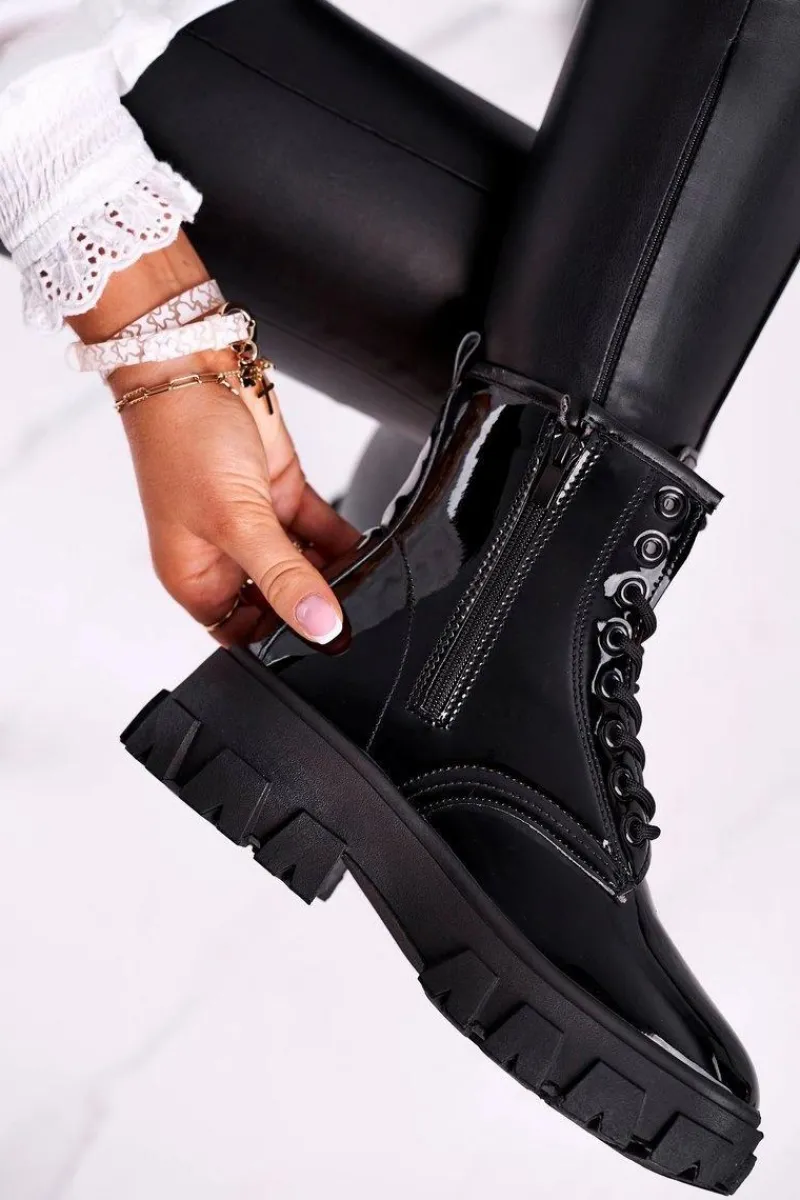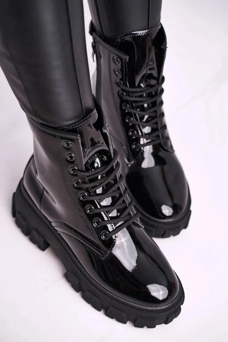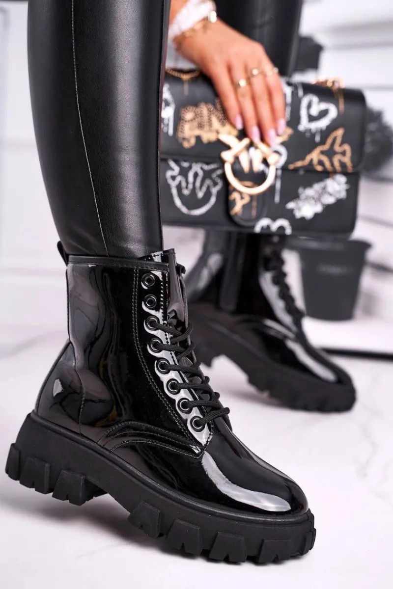 Clearance Botki Damskie Lakierowane Trapery Czarne Linzo Damskie Damskie Trapery|Botki Sznurowane