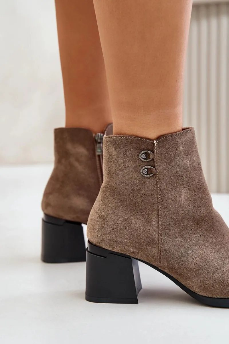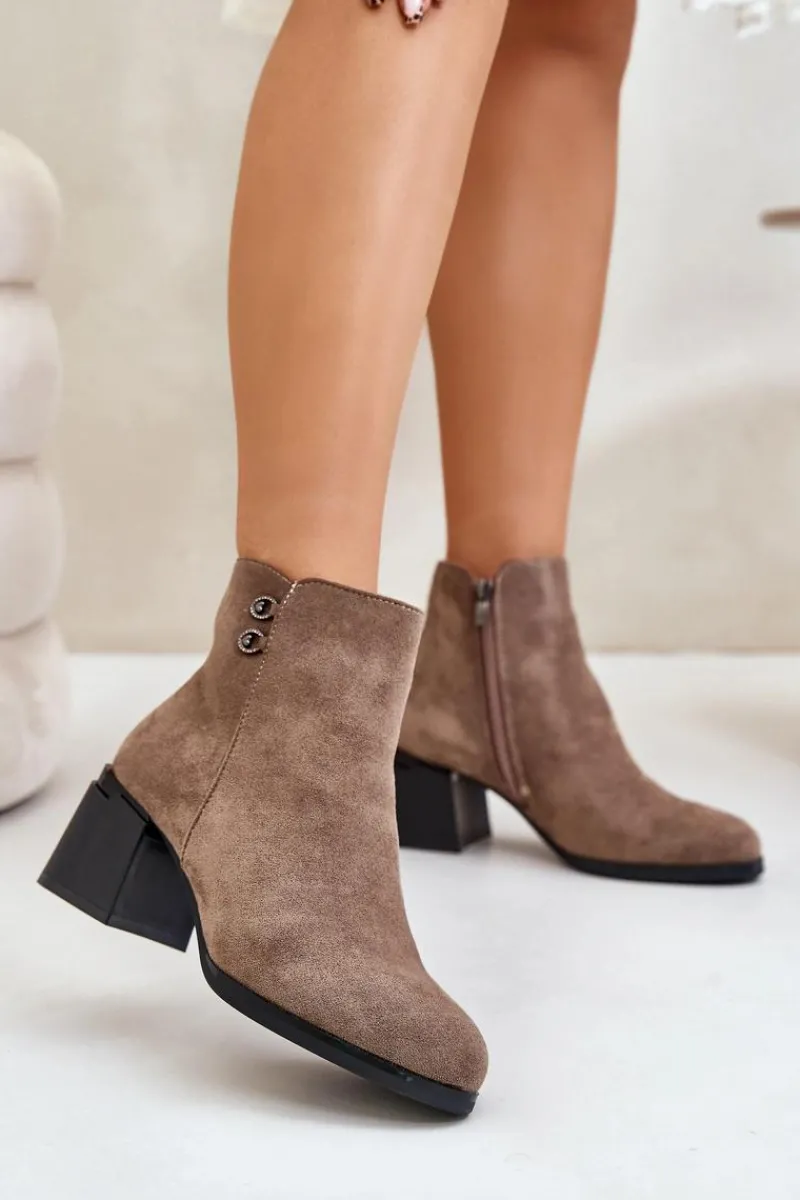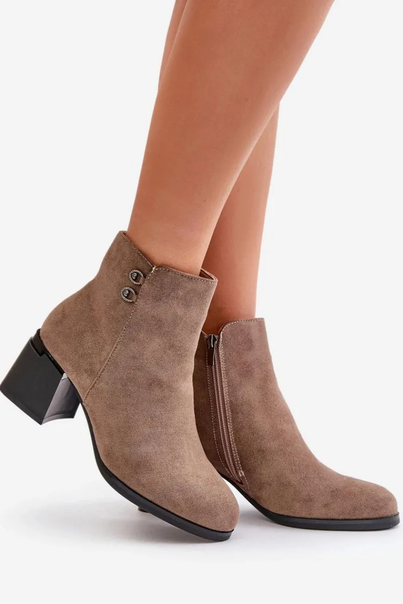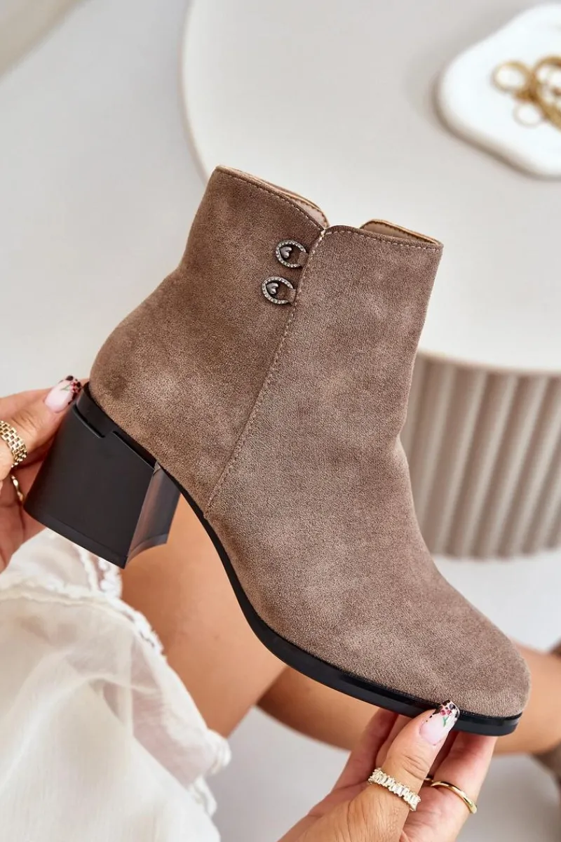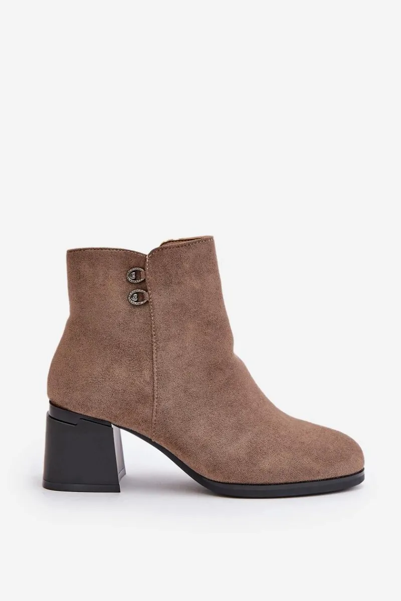 Botki to jedne z najbardziej uniwersalnych i kobiecych butów. Niewątpliwie ten model będzie jednym z Twoich ulubionych! Wykonane z eko skóry. Osadzone na obcasie w formie słupka. Noski zaokrąglone. Zapinane na zamek. Cholewka ozdobiona małymi detalami. Przy wyborze rozmiaru prosimy sugerować się tabelą rozmiarów.