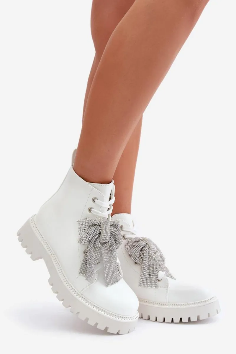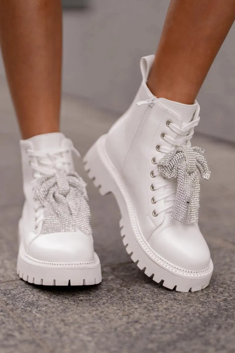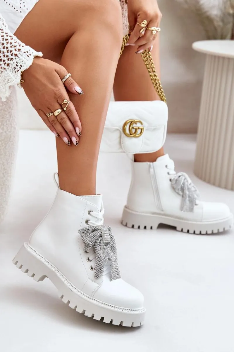 Botki na płaskim obcasie łączą w sobie wygodę i styl, idealnie wpisując się w codzienne i wyjątkowe stylizacje. Zaokrąglone noski nadają im klasyczny wygląd. Zapięcie na zamek ułatwia szybkie zakładanie, a dodatkowe sznurowanie pozwala na idealne dopasowanie do stopy. Główną zaletą tego modelu jest kokarda z cyrkoniami umieszczona z przodu, która dodaje eleganckiego i kobiecego akcentu, przyciągając wzrok i podkreślając wyjątkowość tego obuwia. Przy wyborze rozmiaru prosimy sugerować się tabelą rozmiarów.