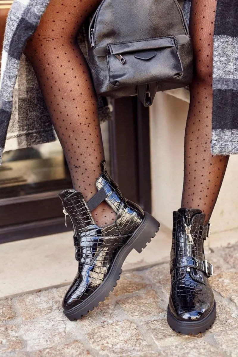 Jeśli chcesz zabłysnąć w świecie mody, to te botki są dla Ciebie! Motyw zwierzęcy wygląda niezwykle efektownie, a klamry dodają charakteru. Wierzch wykonany jest eko skóry. Nie zwlekaj i zamów już dziś! Przy wyborze rozmiaru prosimy sugerować się tabelą rozmiarów.
