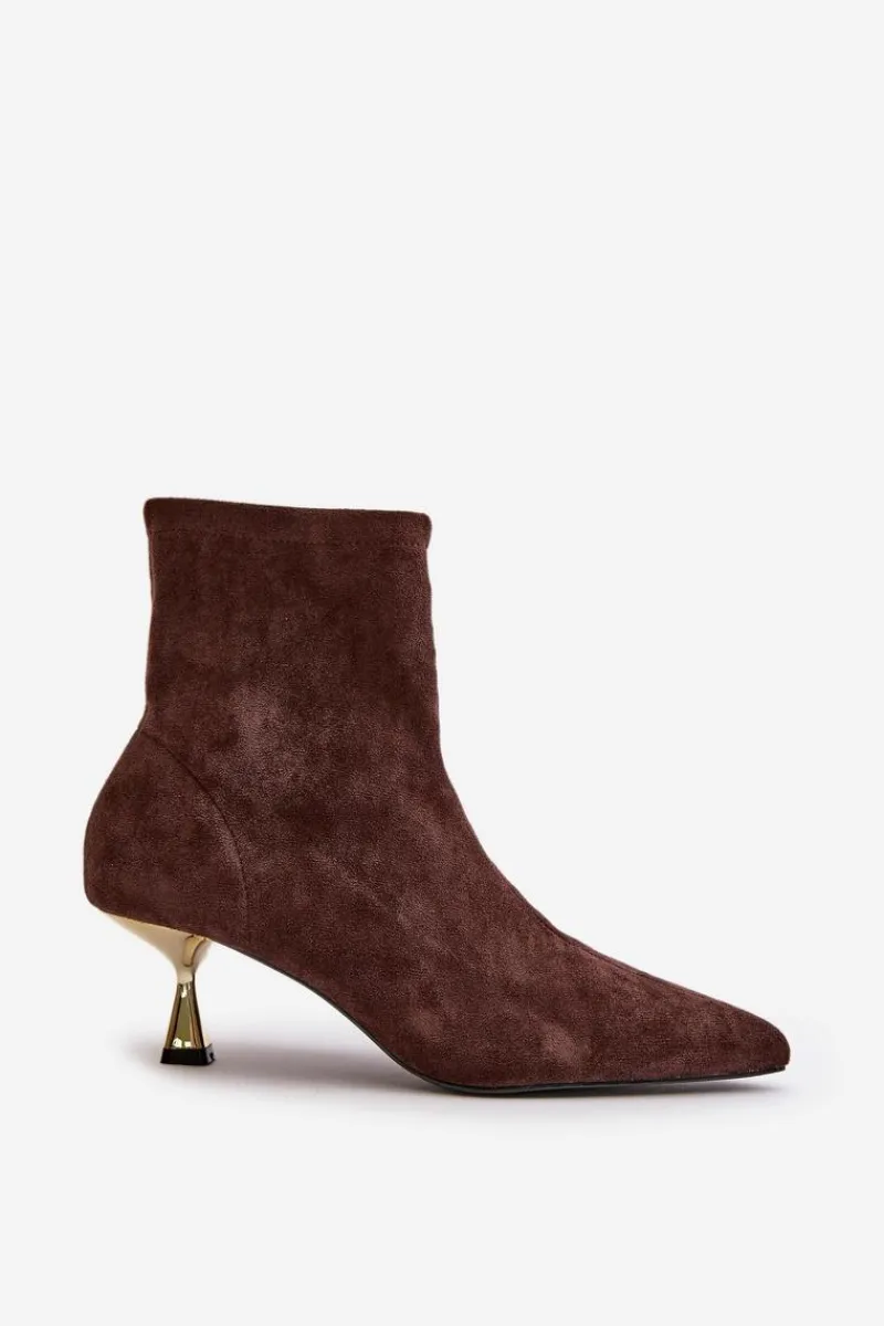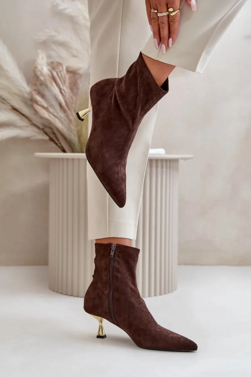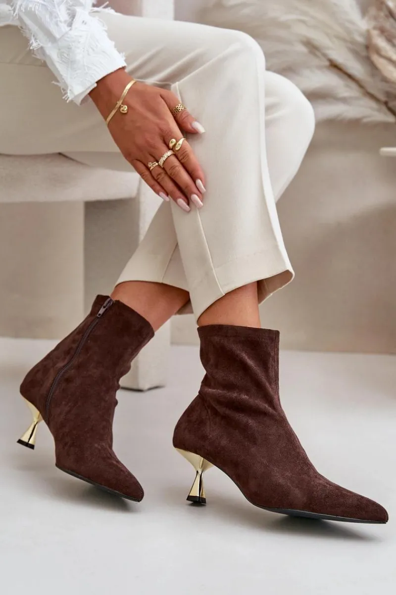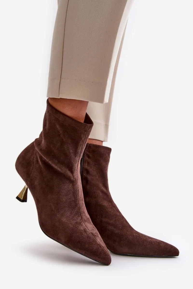 Stylowe botki damskie na ozdobnej szpilce to elegancki dodatek, który z pewnością przyciągnie spojrzenia. Wykonane z eko zamszu. Zapinane na zamek, który zapewnia wygodę i łatwość zakładania. Noski w szpic dodają wyrafinowanego charakteru, podkreślając kobiecość i smukłość sylwetki. Idealne na specjalne okazje, jak i do codziennych stylizacji, kiedy chcesz dodać sobie odrobinę elegancji. Przy wyborze rozmiaru prosimy sugerować się tabelą rozmiarów.