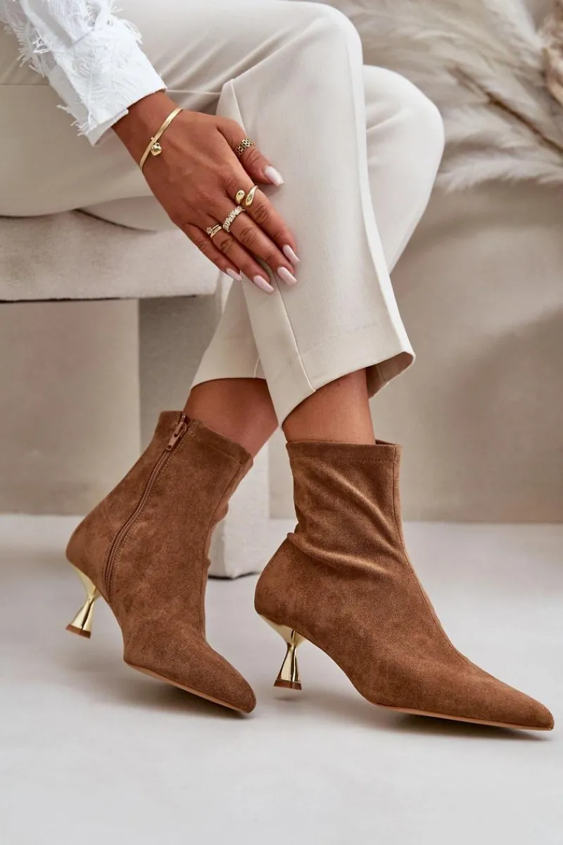 Stylowe botki damskie na ozdobnej szpilce to elegancki dodatek, który z pewnością przyciągnie spojrzenia. Wykonane z eko zamszu. Zapinane na zamek, który zapewnia wygodę i łatwość zakładania. Noski w szpic dodają wyrafinowanego charakteru, podkreślając kobiecość i smukłość sylwetki. Idealne na specjalne okazje, jak i do codziennych stylizacji, kiedy chcesz dodać sobie odrobinę elegancji. Przy wyborze rozmiaru prosimy sugerować się tabelą rozmiarów.