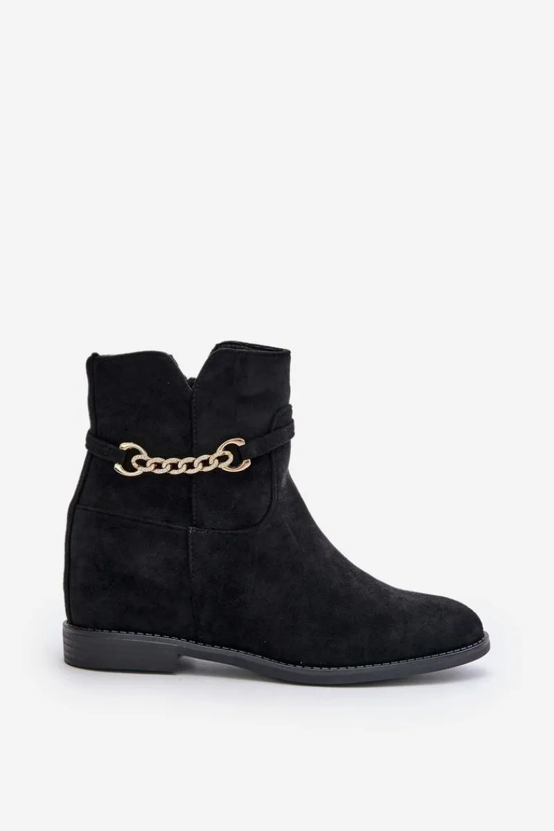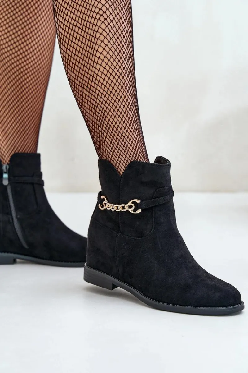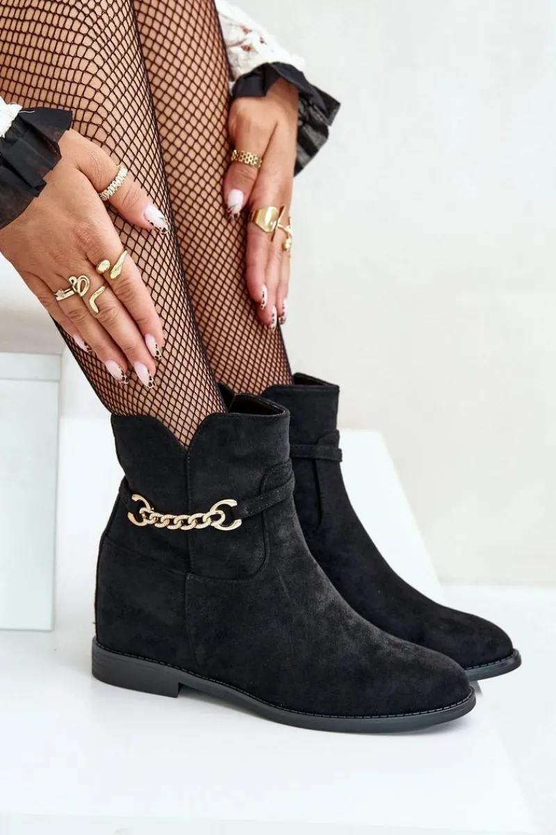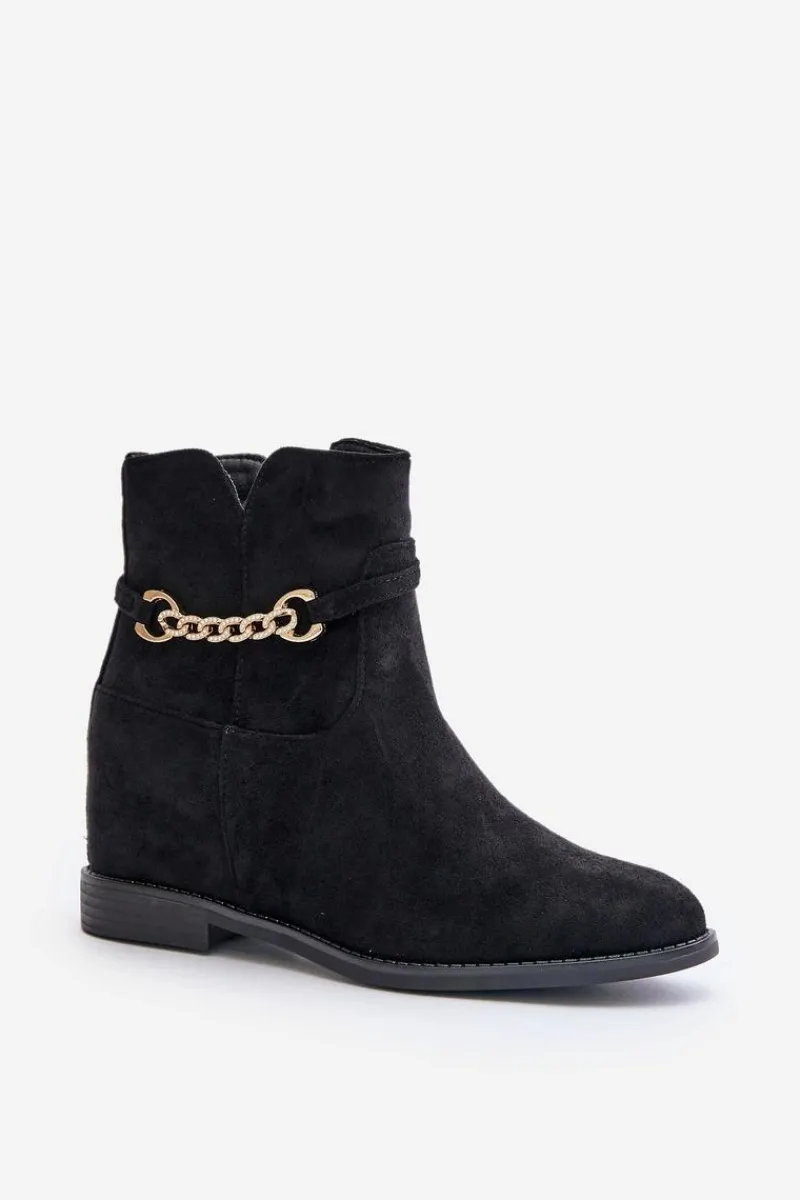 Botki damskie wykonane z eko zamszu. Osadzone na płaskim obcasie i ukrytym koturnie. Noski zaokrąglone. Zapinane na zamek. Dodatkowym atutem tego modelu jest cienki paseczek ze złotym, krótkim łańcuszkiem. Przy wyborze rozmiaru prosimy sugerować się tabelą rozmiarów.