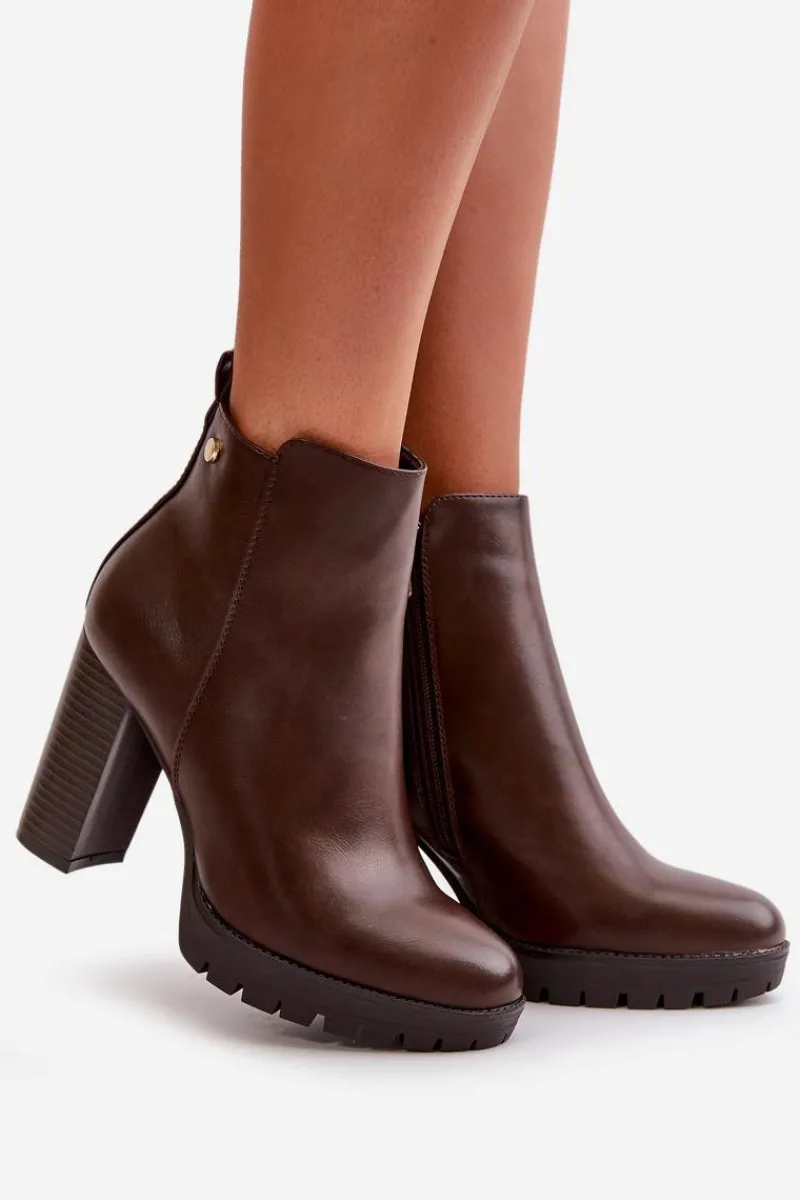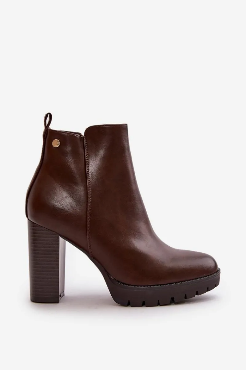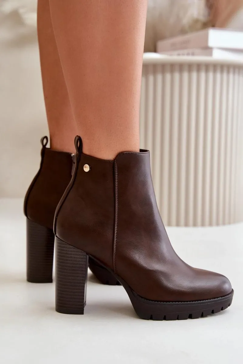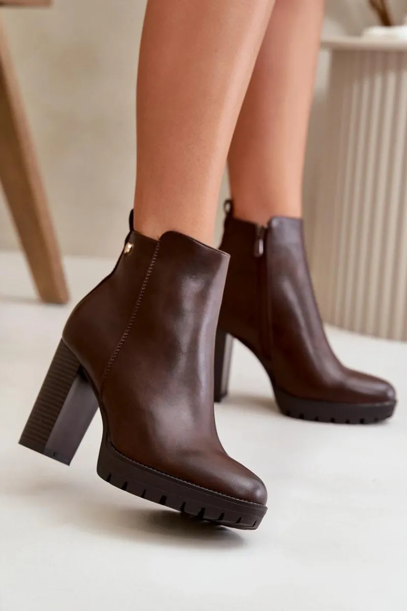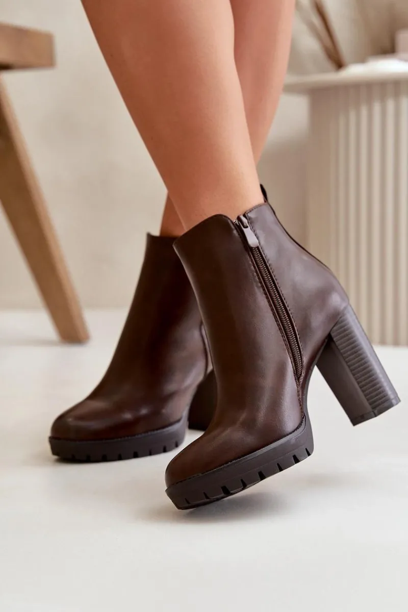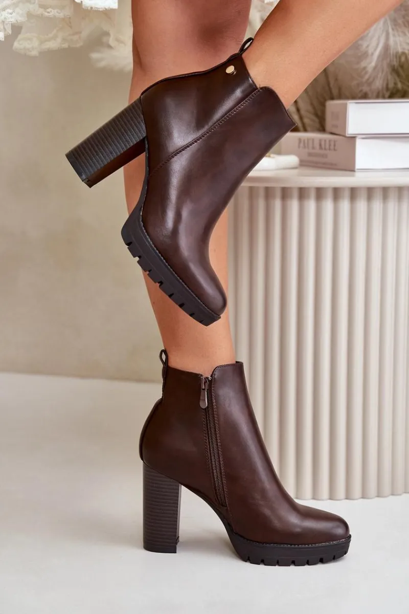 Damskie botki wykonane z eko skóry. Osadzone na wysokim obcasie w postaci słupka. Środek ocieplony kocem obuwniczym zapewnia komfort w chłodniejsze dni. Zapinane na zamek. Doskonałe do jesiennych stylizacji. Przy wyborze rozmiaru prosimy sugerować się tabelą rozmiarów.