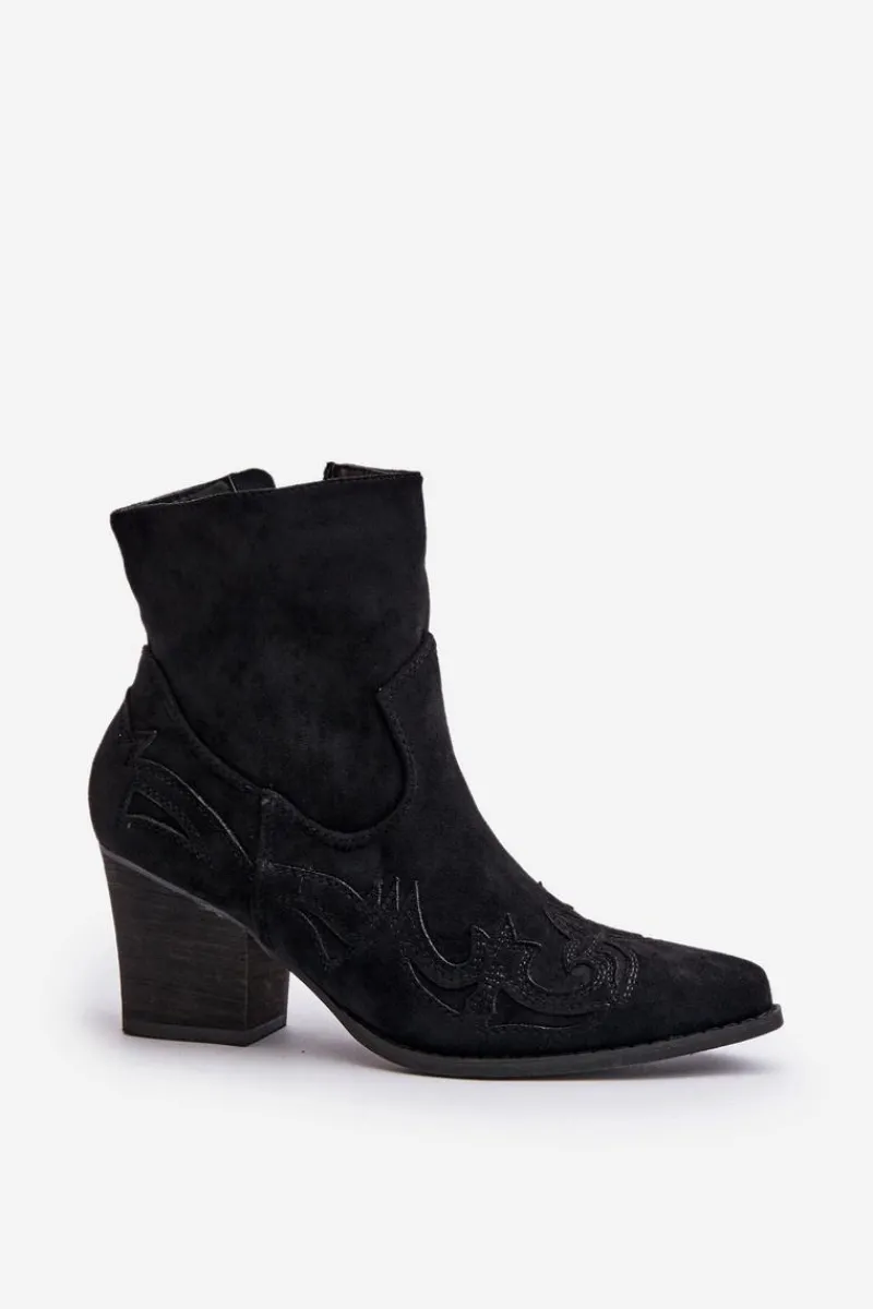 Botki o fasonie kowbojek zostały wykonane z eko zamszu. Zapinane na zamek błyskawiczny. Dodatkowo posiadają usztywniany zapiętek. Model ten wyróżnia się przeszyciami na cholewce. Noski w szpic optycznie wysmuklą nogi. Botki typu kowbojki będą świetnym uzupełnieniem wielu stylizacji. Możesz nosić je w wielu stylizacjach m.in.: do sukienek, zwiewnych spódnic czy spodni jeansowych. Przy wyborze rozmiaru prosimy sugerować się tabelą rozmiarów.