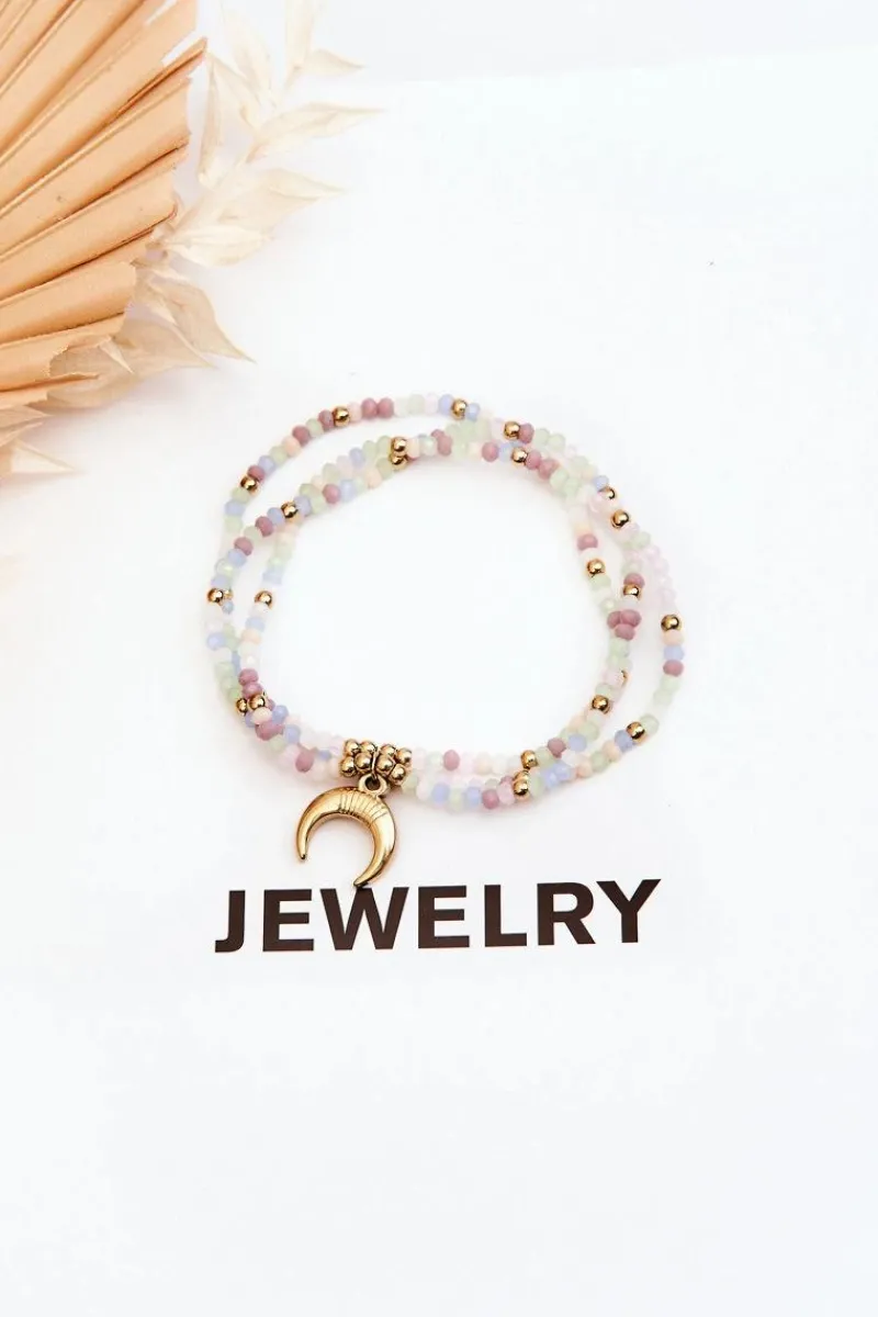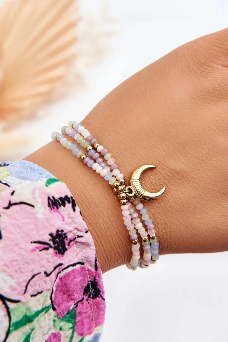 Wykonana ze stali nierdzewnej i ozdobnych koralików z tworzywa. Model potrójny, na żyłce, która delikatnie się rozciąga. Bransoletka posiada piękną zawieszkę z motywem księżyca. Świetnie sprawdzi się do casualowych, ale i tych bardziej eleganckich stylizacji.