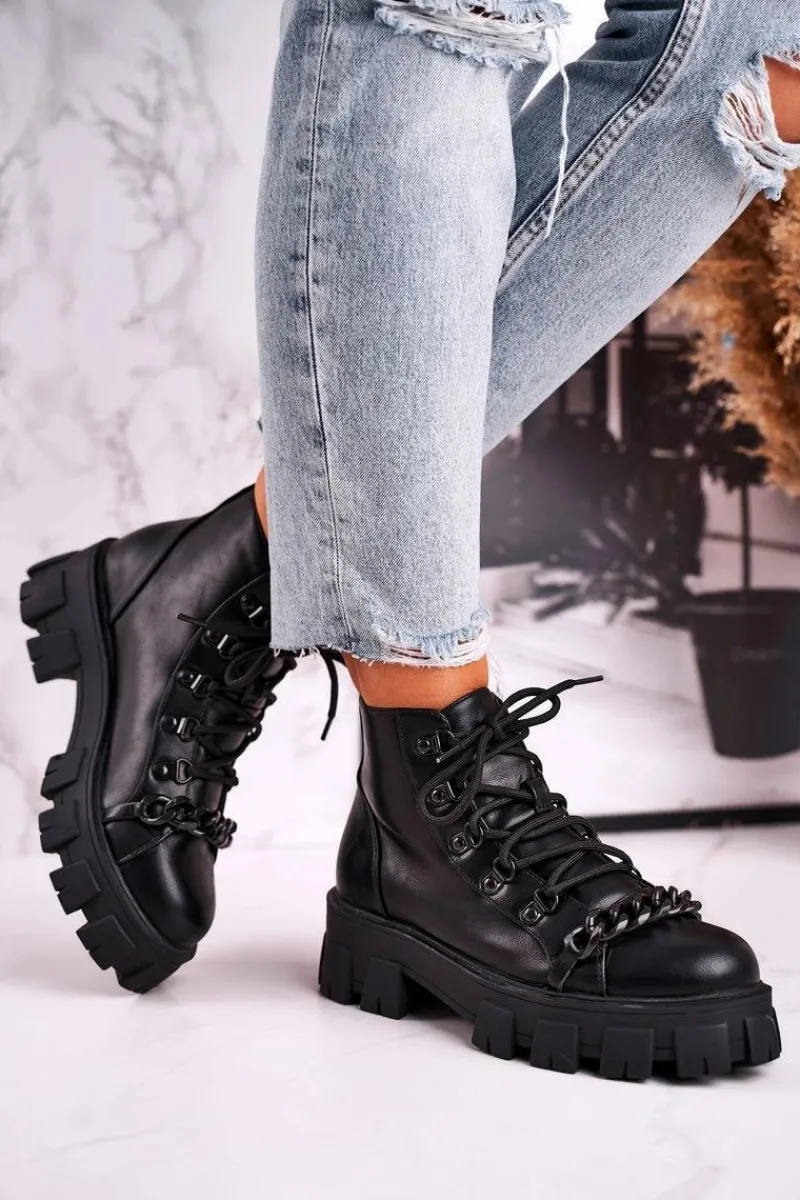 Clearance Boto Damskie Botki Workery Na Platformie Czarne Chain