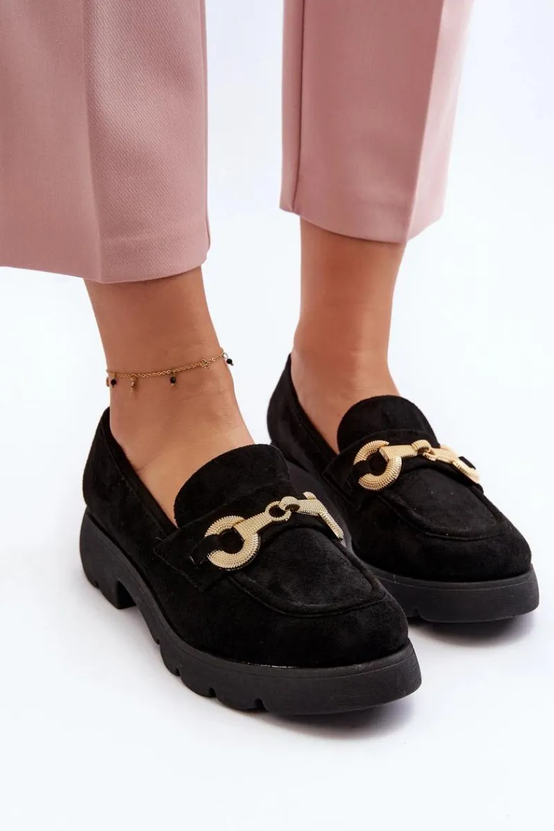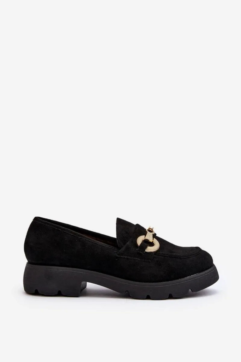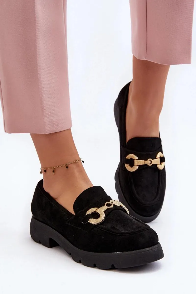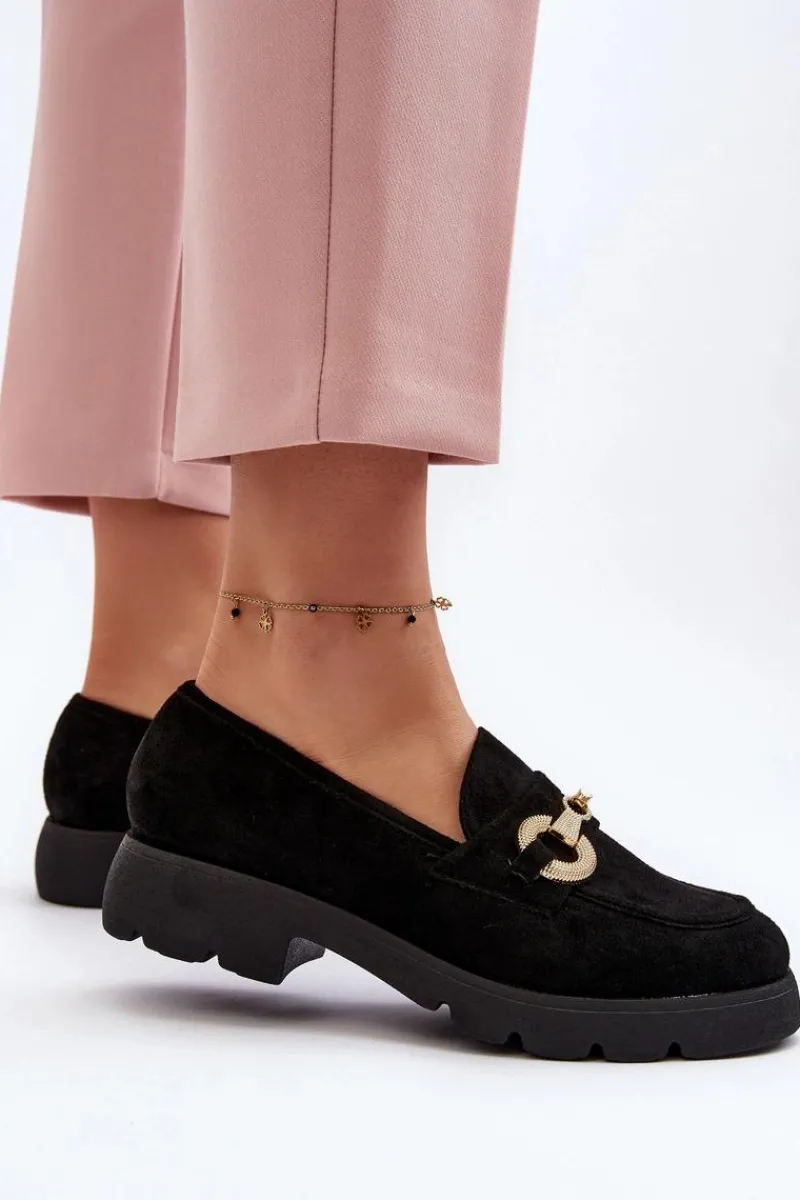 Mokasyny damskie wykonane z miłego w dotyku eko zamszu. Osadzona na płaskim obcasie. Noski zaokrąglone. Z przodu złota ozdoba. Wkładka z eko skóry zapewni wygodę podczas noszenia. Ten modny fason z pewnością wykorzystasz do wielu stylizacji! Przy wyborze rozmiaru prosimy sugerować się tabelą rozmiarów.