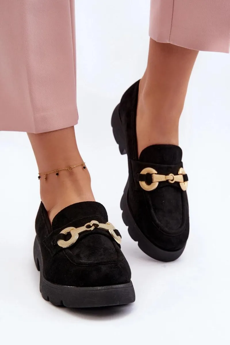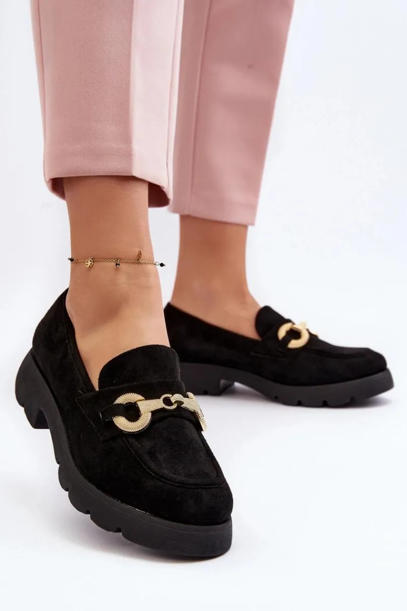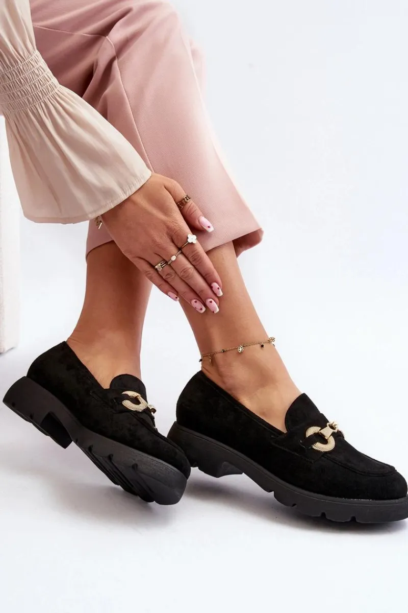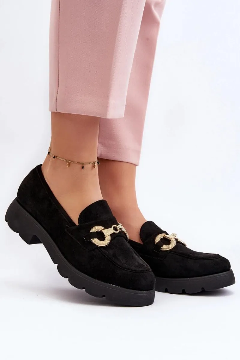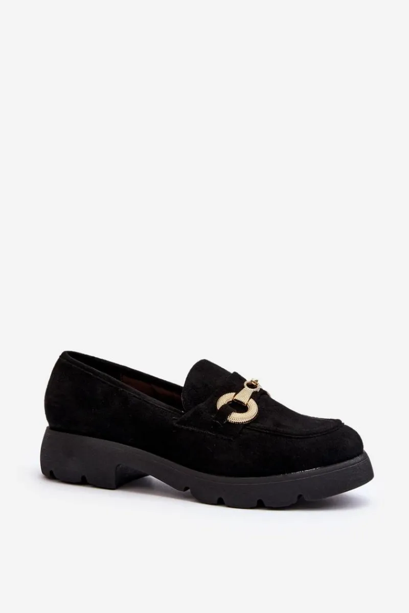 Mokasyny damskie wykonane z miłego w dotyku eko zamszu. Osadzona na płaskim obcasie. Noski zaokrąglone. Z przodu złota ozdoba. Wkładka z eko skóry zapewni wygodę podczas noszenia. Ten modny fason z pewnością wykorzystasz do wielu stylizacji! Przy wyborze rozmiaru prosimy sugerować się tabelą rozmiarów.