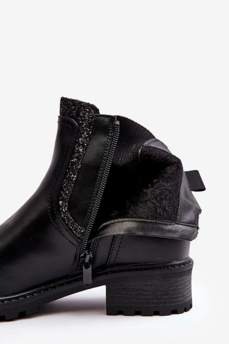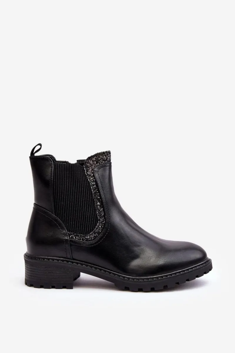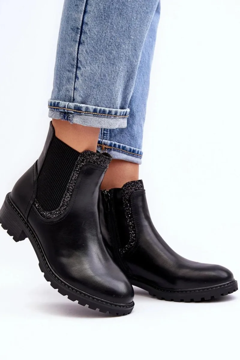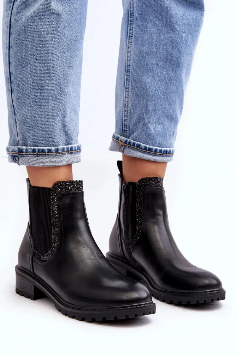 Botki damskie z cholewką za kostkę. Wykonane z eko skóry. Osadzone na płaskim, stabilnym obcasie. Zapinane na zamek z boku. Cholewka ozdobiona cekinami. Noski zaokrąglone. Usztywniony zapiętek. Ten klasyczny model dopasujesz do wielu jesienno-zimowych stylizacji! Przy wyborze rozmiaru prosimy sugerować się tabelą rozmiarów.