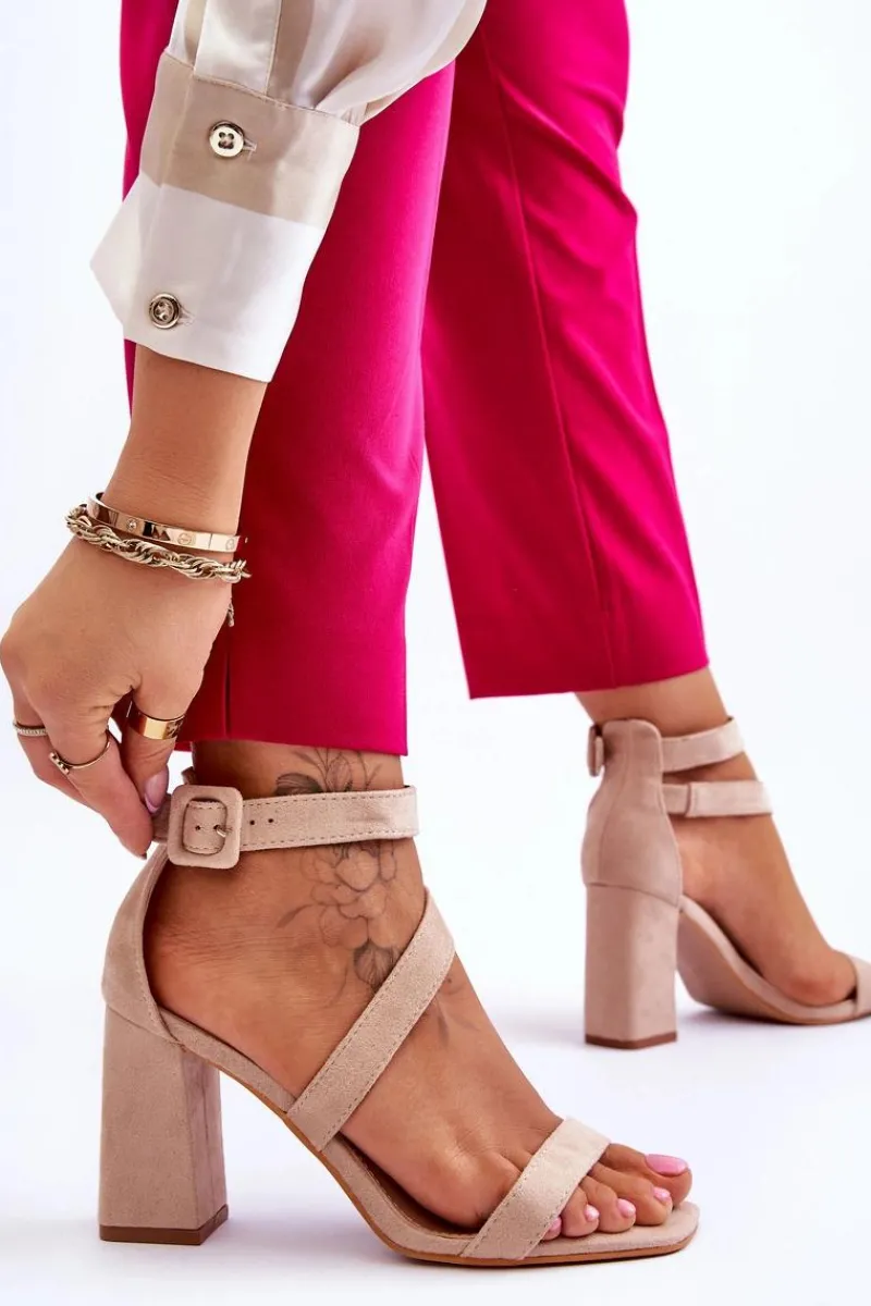 Modne sandałki damskie na obcasie w postaci słupka. Wykonane z eko zamszu z dodatkowym paseczkiem przechodzącym przez środek obuwia. Zapinane wokół kostki na regulowany pasek ze sprzączką. Wkładka z eko skóry jest miękka i wygodna w użytkowaniu. Buty te świetnie sprawdzą się w upalne dni podczas randki, uroczystości czy ważnego spotkania. Przy wyborze rozmiaru prosimy sugerować się tabelą rozmiarów.
