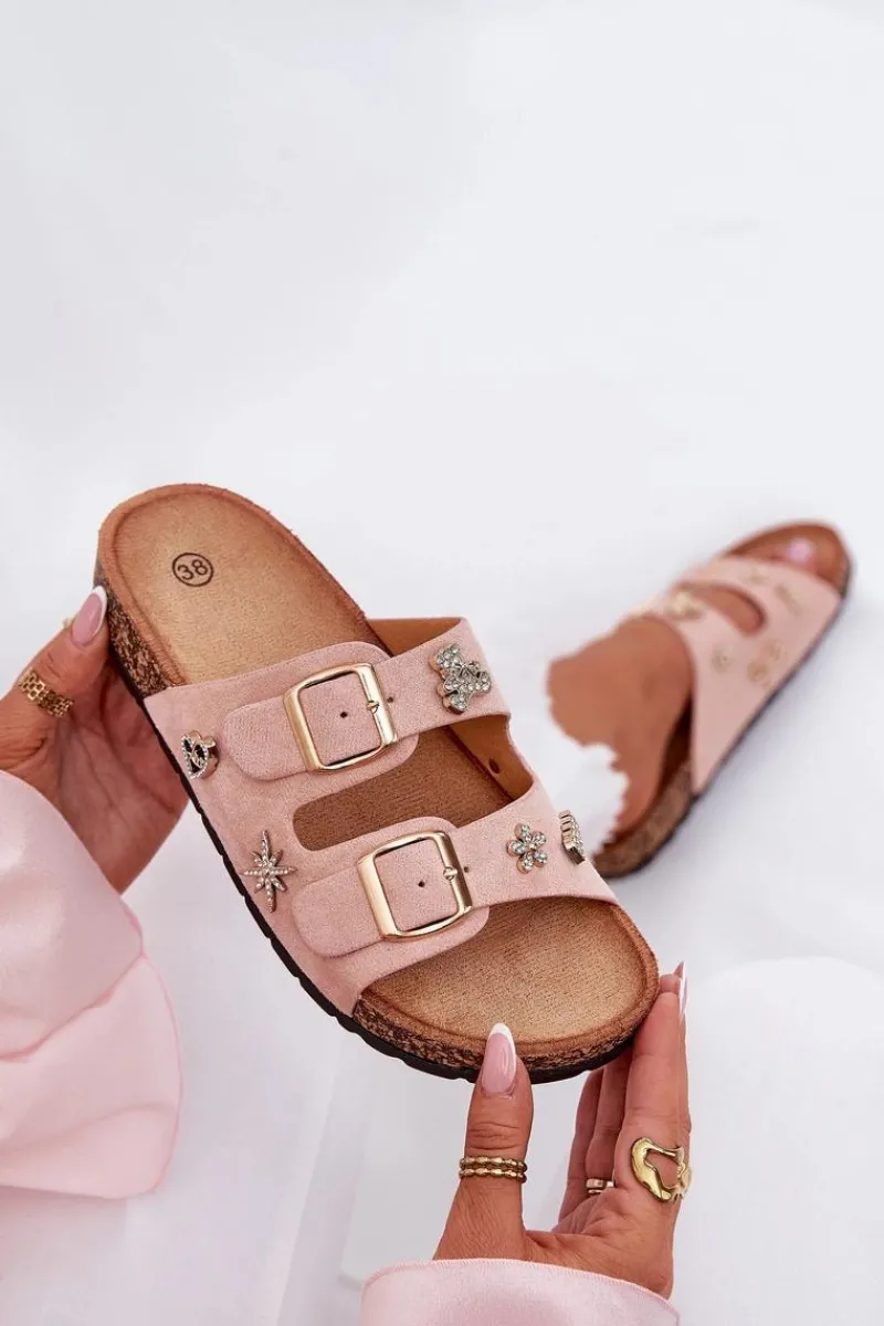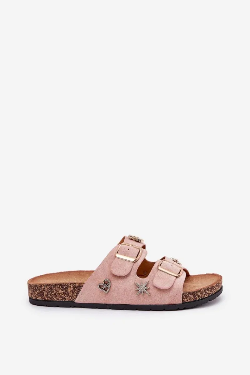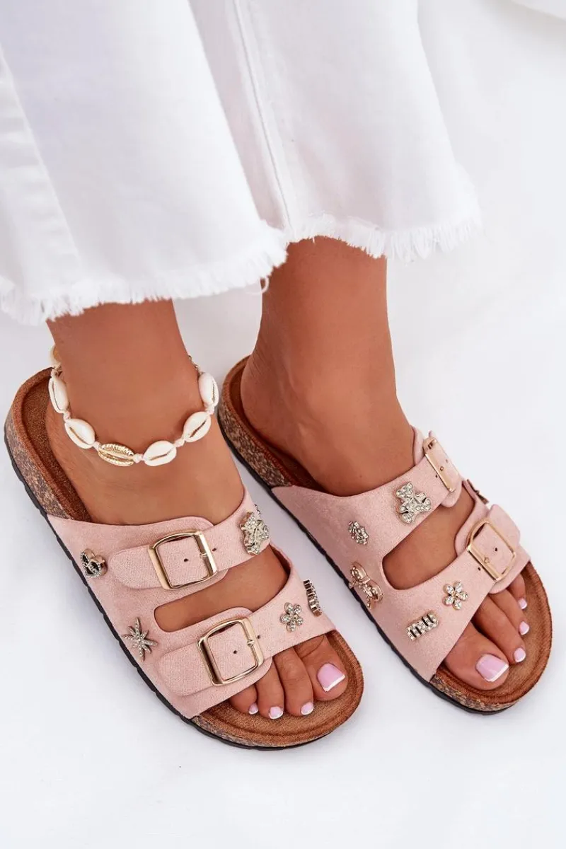Klapki damskie wykonane z eko zamszu, osadzone na lekkiej korkowej podeszwie. Model ten wyróżnia się stylowymi klamrami oraz ozdobnymi przypinkami, które nadają mu unikalnego charakteru. Wygodne i modne – doskonałe na letnie dni! Przy wyborze rozmiaru prosimy sugerować się tabelą rozmiarów.