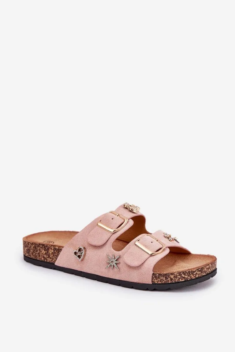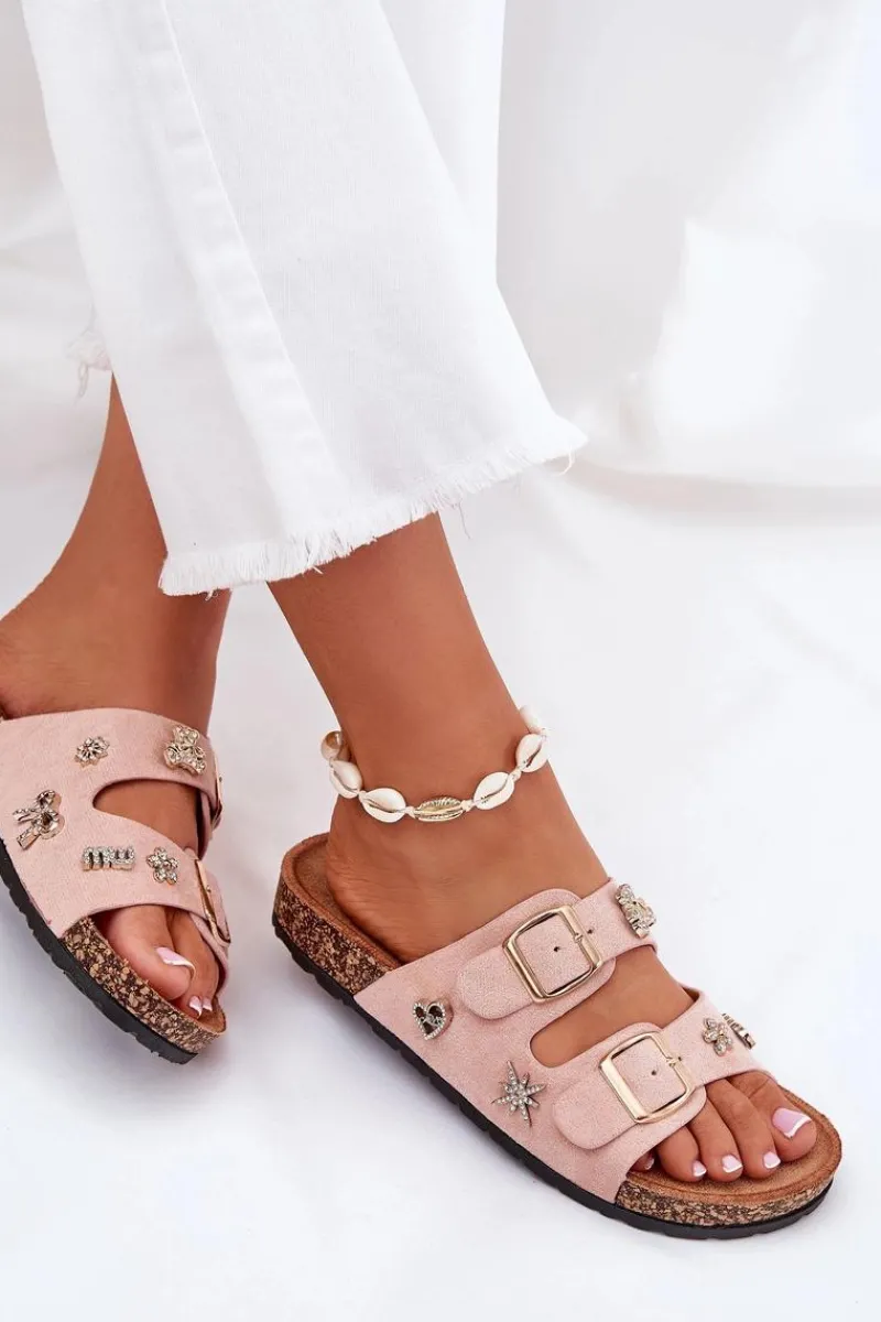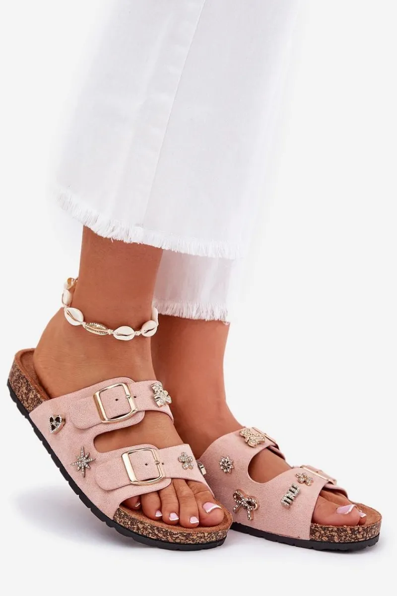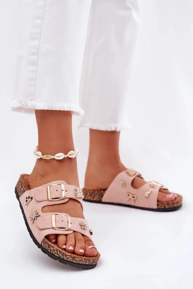 Klapki damskie wykonane z eko zamszu, osadzone na lekkiej korkowej podeszwie. Model ten wyróżnia się stylowymi klamrami oraz ozdobnymi przypinkami, które nadają mu unikalnego charakteru. Wygodne i modne – doskonałe na letnie dni! Przy wyborze rozmiaru prosimy sugerować się tabelą rozmiarów.