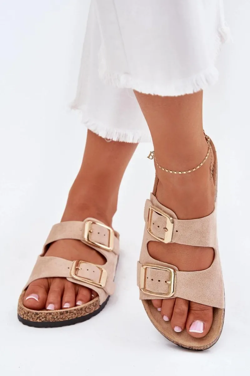 Klapki damskie z eko zamszu na korkowej podeszwie to stylowy wybór na ciepłe dni. Dwa regulowane paski ze złotymi klamrami nadają im eleganckiego charakteru, a jednocześnie zapewniają komfort i idealne dopasowanie. Doskonałe do codziennych stylizacji, łączą wygodę z modnym wyglądem, idealne na spacer czy wakacyjny wyjazd. Przy wyborze rozmiaru prosimy sugerować się tabelą rozmiarów.