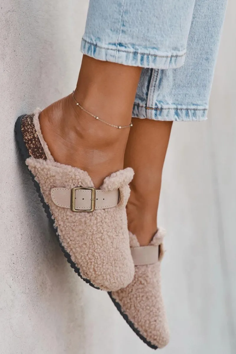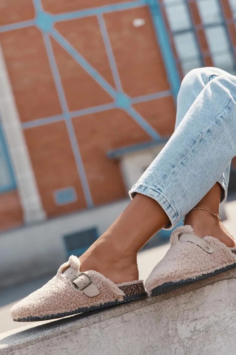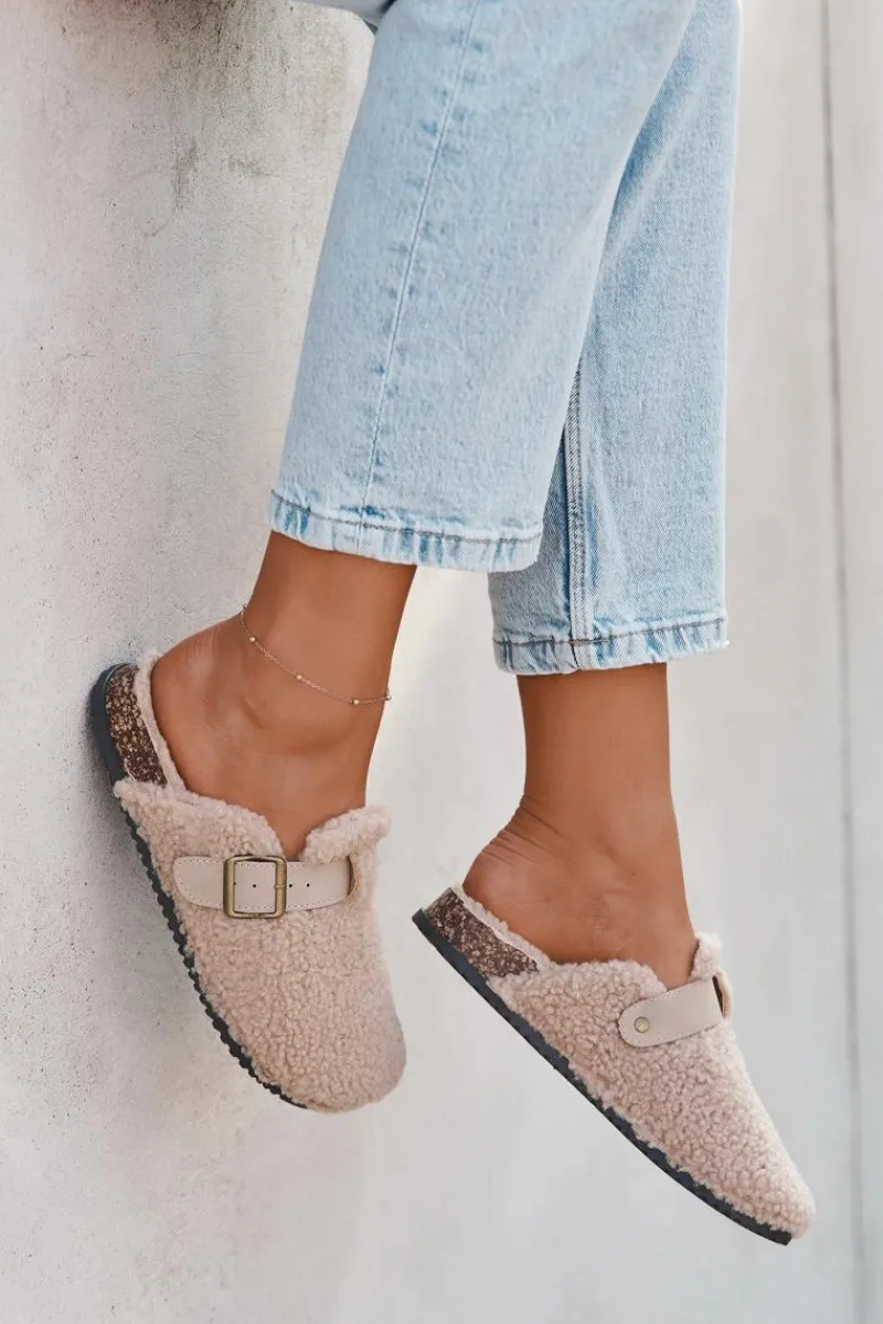 Damskie klapki z futerkiem typu baranek to idealne połączenie wygody i stylu. Zakryte, zaokrąglone noski zapewniają komfort noszenia, a regulowany pasek z klamrą pozwala dopasować obuwie do stopy. Miękka wyściółka sprawia, że klapki są wyjątkowo przyjemne w użytkowaniu – świetnie sprawdzą się zarówno w domu, jak i w casualowych, codziennych stylizacjach. Przy wyborze rozmiaru prosimy sugerować się tabelą rozmiarów.