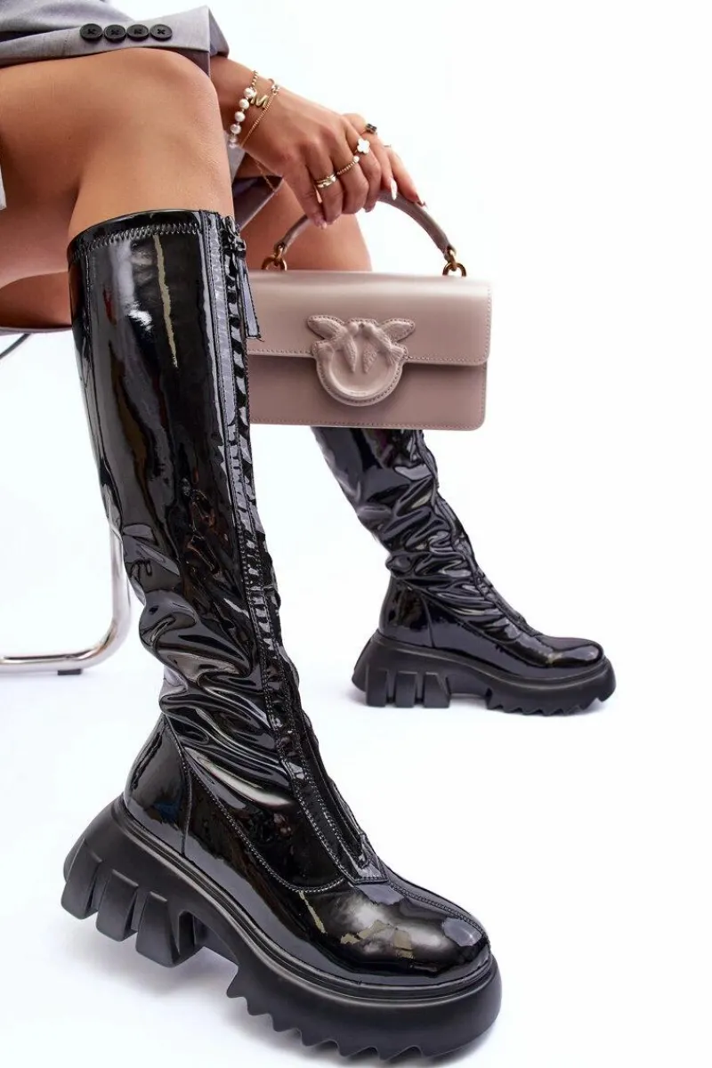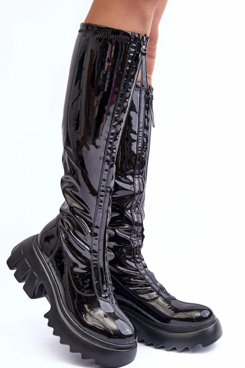 Modne, damskie kozaki do kolana. Wykonane z eko skóry. Osadzone na masywnej platformie i płaskim obcasie. Model zapinany na suwak, który znajduje się na całej długości cholewki z przodu. Zapiętek jest usztywniany, noski zaokrąglone. Środek ocieplony kocem obuwniczym. Przy wyborze rozmiaru prosimy kierować tabelą rozmiarów.