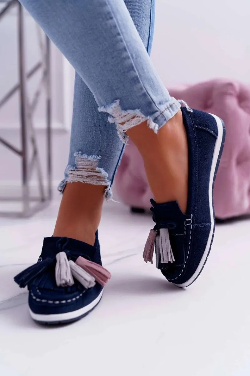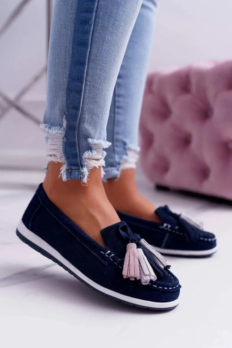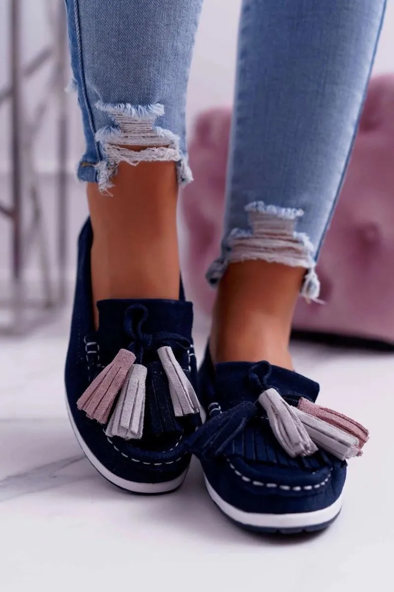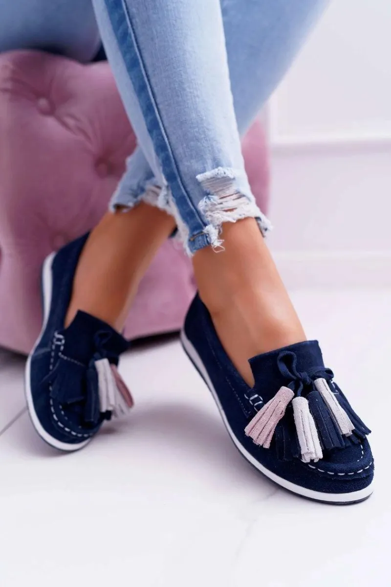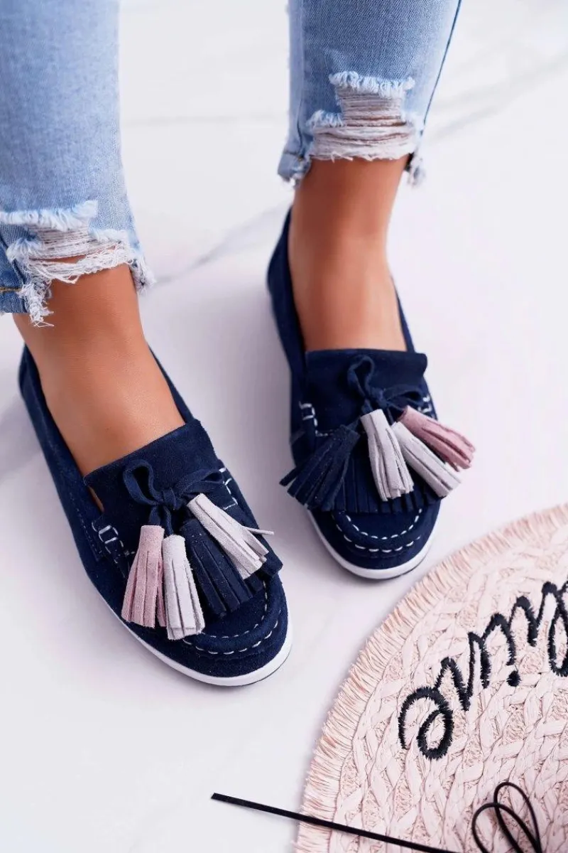 Clearance Boto Mokasyny Damskie Skórzane Zamszowe Z Frędzlami Granatowe Batist
