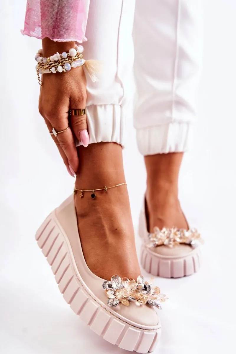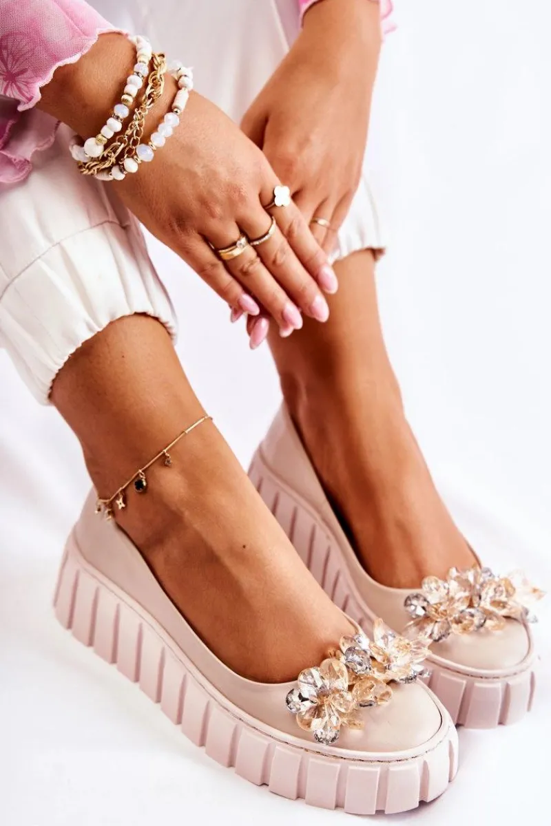 Damskie baleriny wykonane z naturalnej skóry z dbałością o każdy detal. O komfort zadba miękka, skórzana wkładka. Podeszwa wykonana z gumowego tworzywa ze żłobieniami po bokach. Dodatkowo jest antypoślizgowa. Zapiętek jest usztywniany. Z przodu elegancka ozdoba w postaci imitacji kryształków doda tym butom uroku. Nosek zaokrąglony. Baleriny dopełnią wiele Twoich stylizacji. Przy wyborze rozmiaru prosimy sugerować się tabelą rozmiarów.