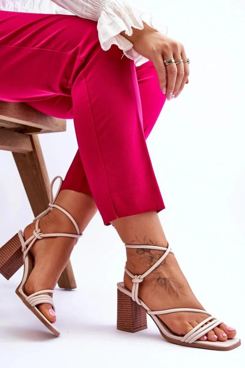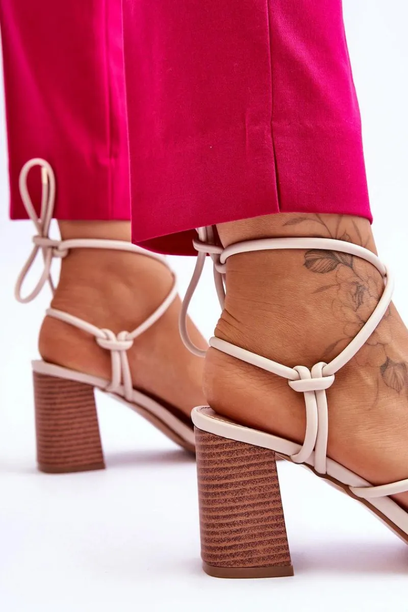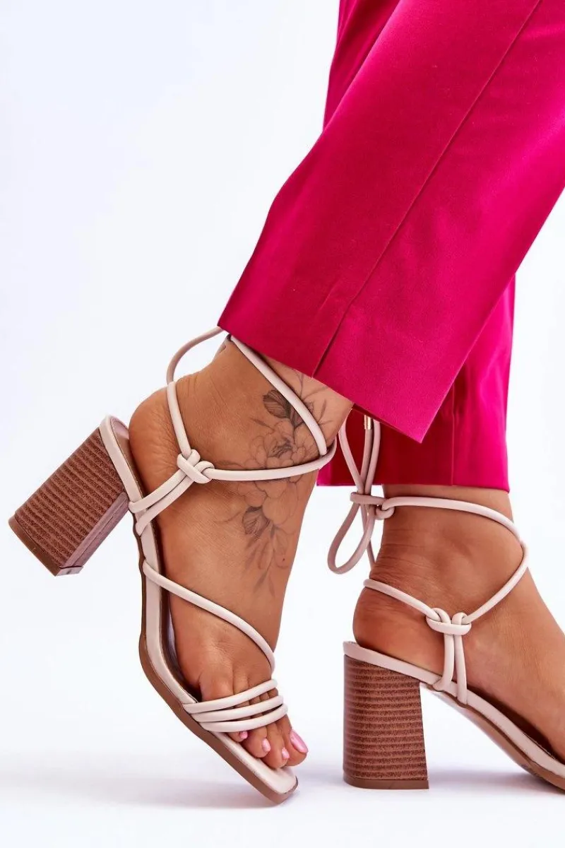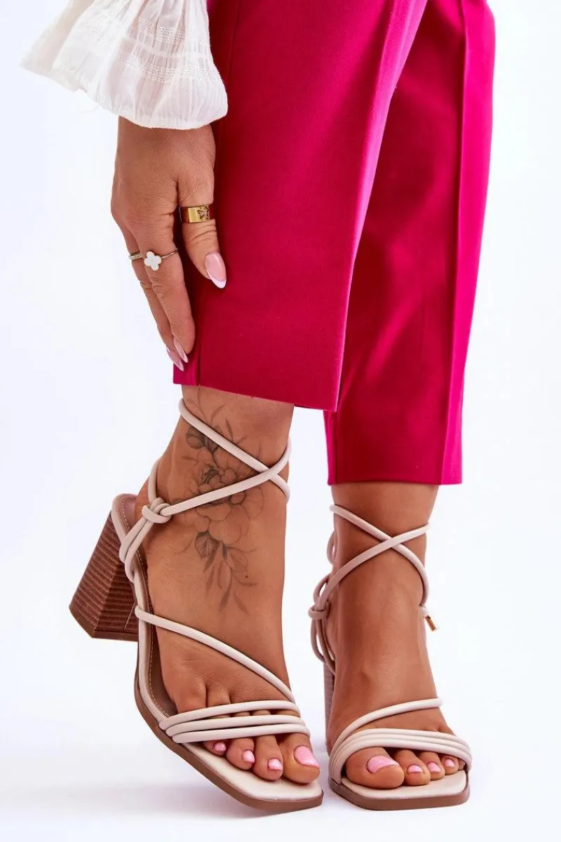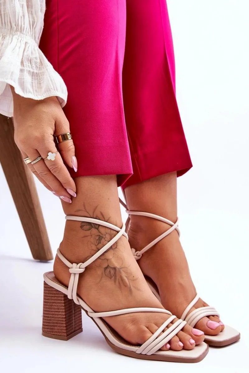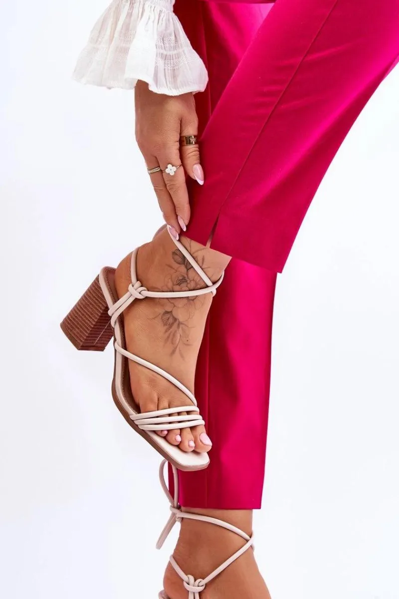 Niezwykłe sandałki na obcasie w postaci słupka świetnie sprawdzą się podczas upalnych dni. Idealnie będą prezentować się zarówno ze spodniami, jak i sukienkami. Buty zostały wykonane z eko skóry. Model ten posiada wiązanie wokół łydki. Sandałki posiadają odkryte palce oraz piętę. Miękka wkładka została wykonana z eko skóry. Ten model powinien być Twój! Przy wyborze rozmiaru prosimy sugerować się tabelą rozmiarów.