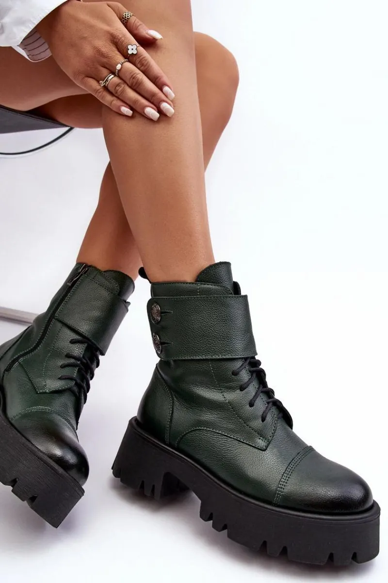 Botki damskie wykonane ze skóry naturalnej. Osadzone na masywnym, płaskim obcasie i platformie. Zapinane na suwak z boku. Cholewka ozdobiona szerokim paskiem. Wnętrze ocieplone kocem obuwniczym. Podeszwa jest antypoślizgowa. Model ten będzie pasować do wielu jesienno-zimowych stylizacji! Przy wyborze rozmiaru prosimy kierować się tabelą rozmiarów