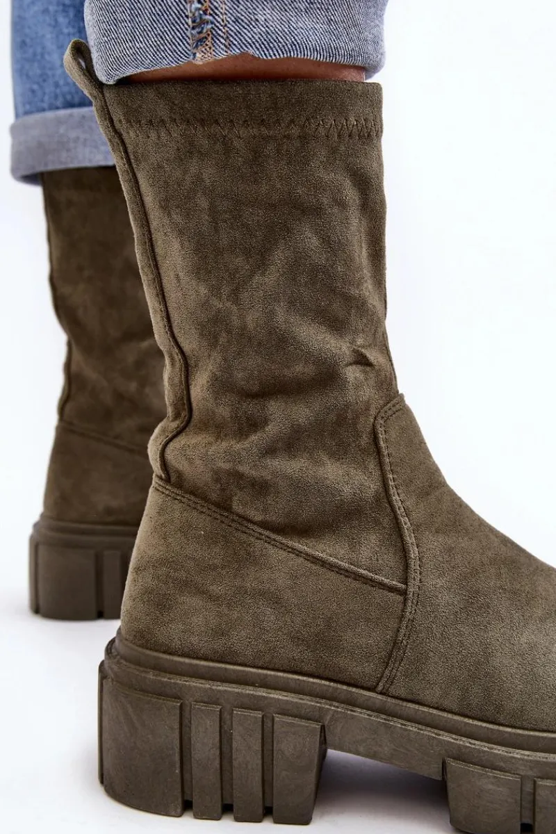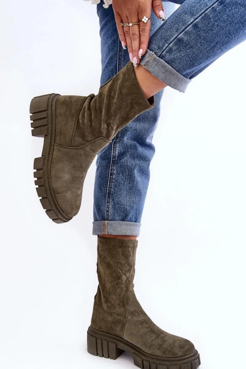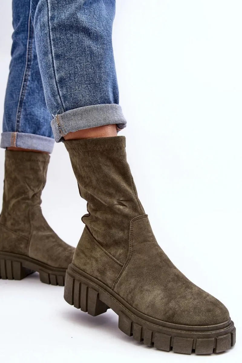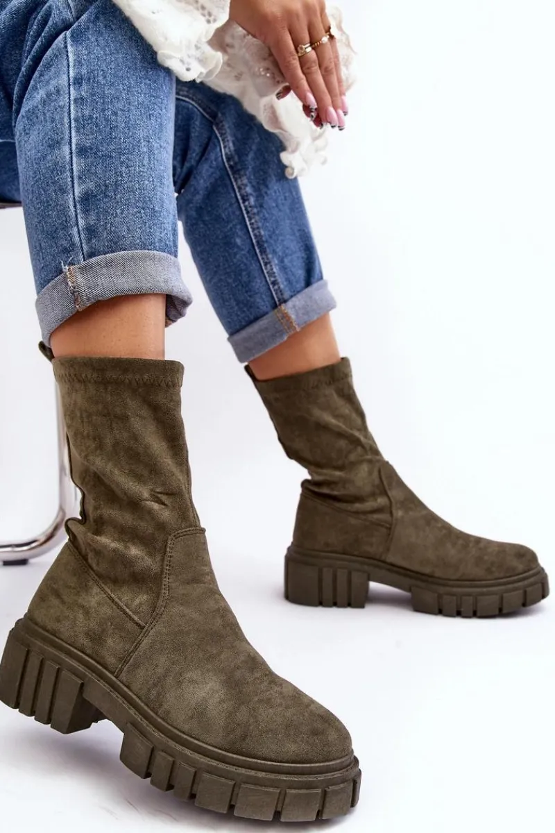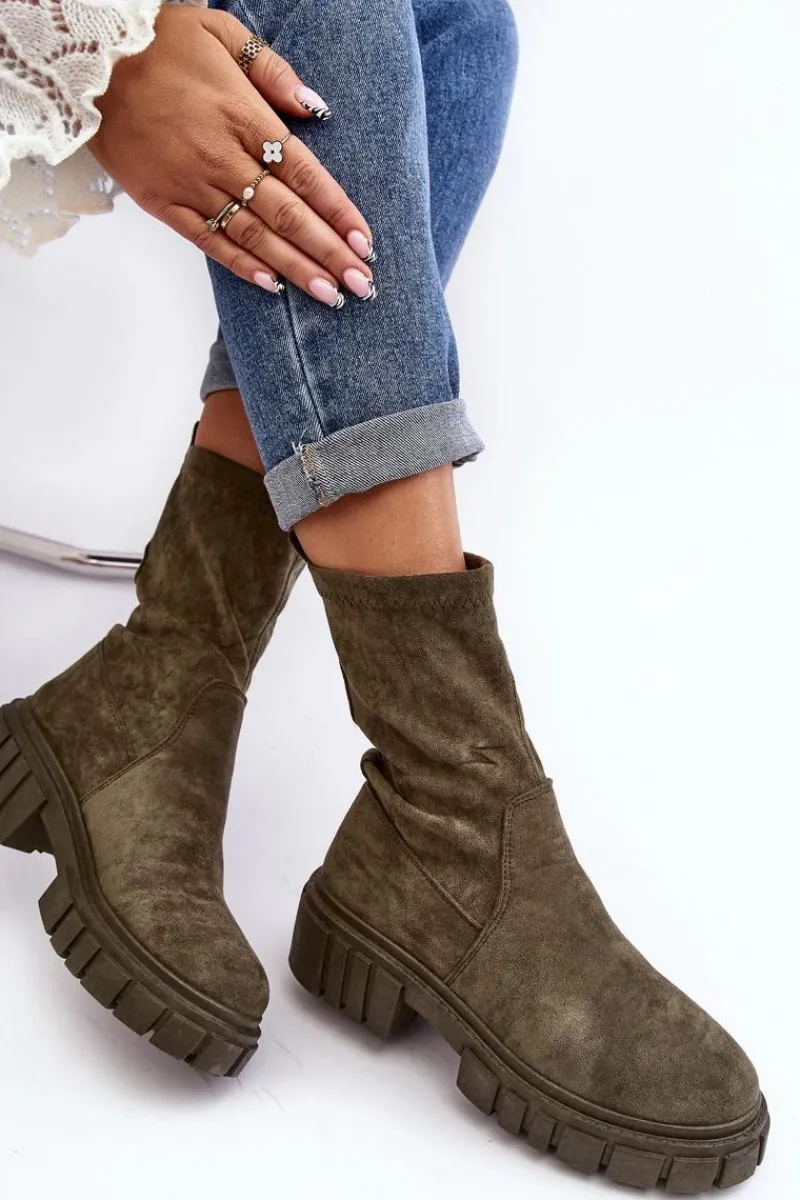 Wsuwane botki damskie wykonane z eko zamszu. Osadzone na masywnym, płaskim obcasie i platformie. Nieocieplone. Miękka wkładka zapewni komfort podczas użytkowania. Zapiętek w tym obuwiu jest usztywniany. Model ten dopasujesz do wielu jesiennych stylizacji! Przy wyborze rozmiaru prosimy sugerować się tabelą rozmiarów.