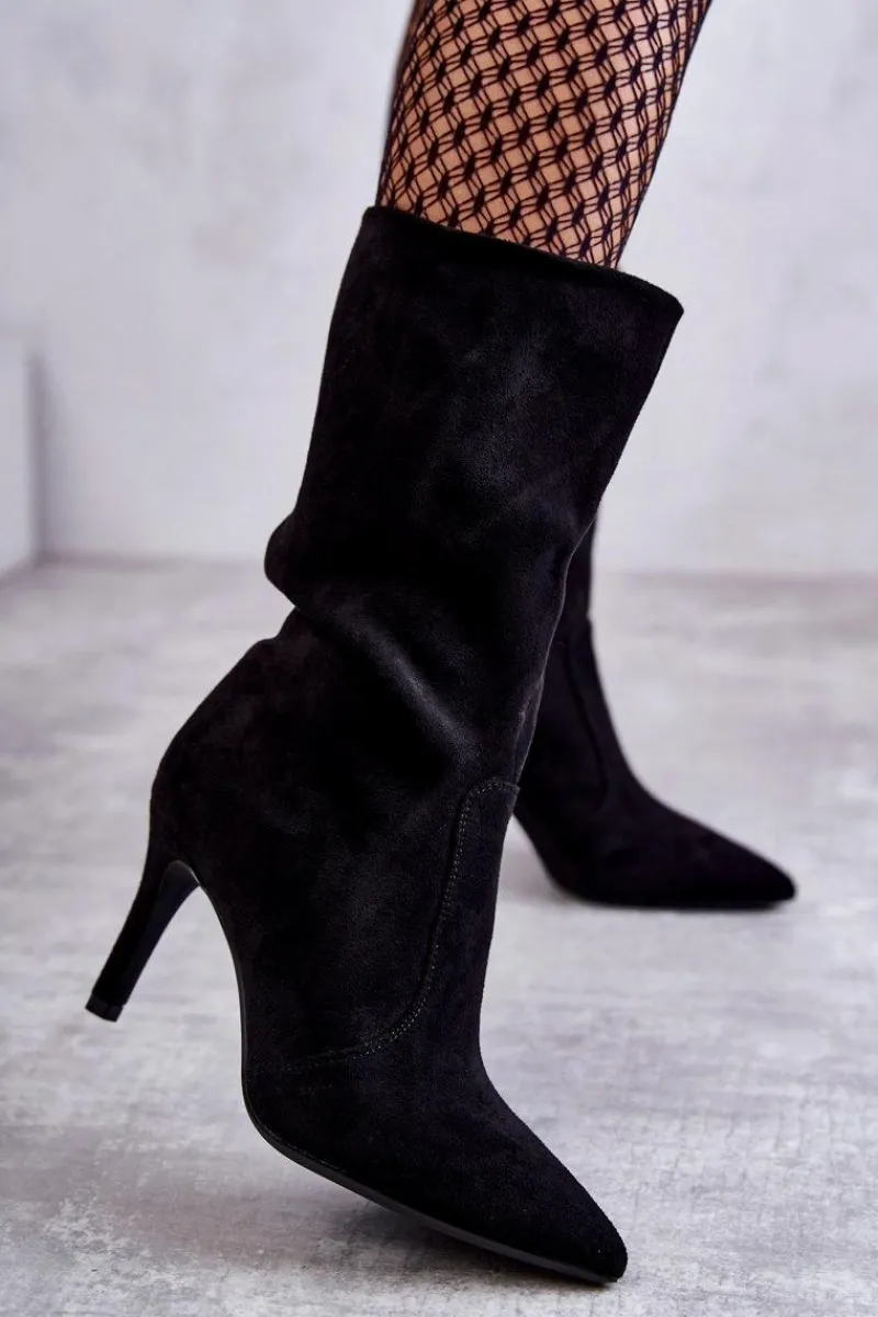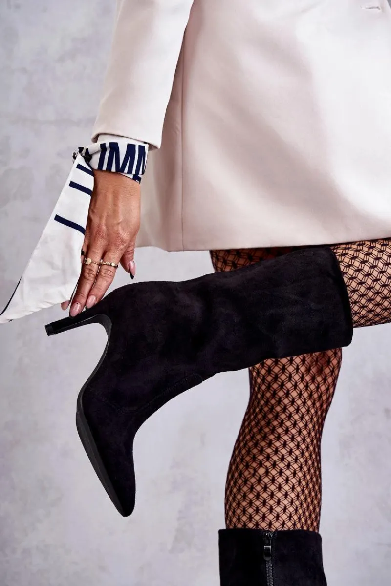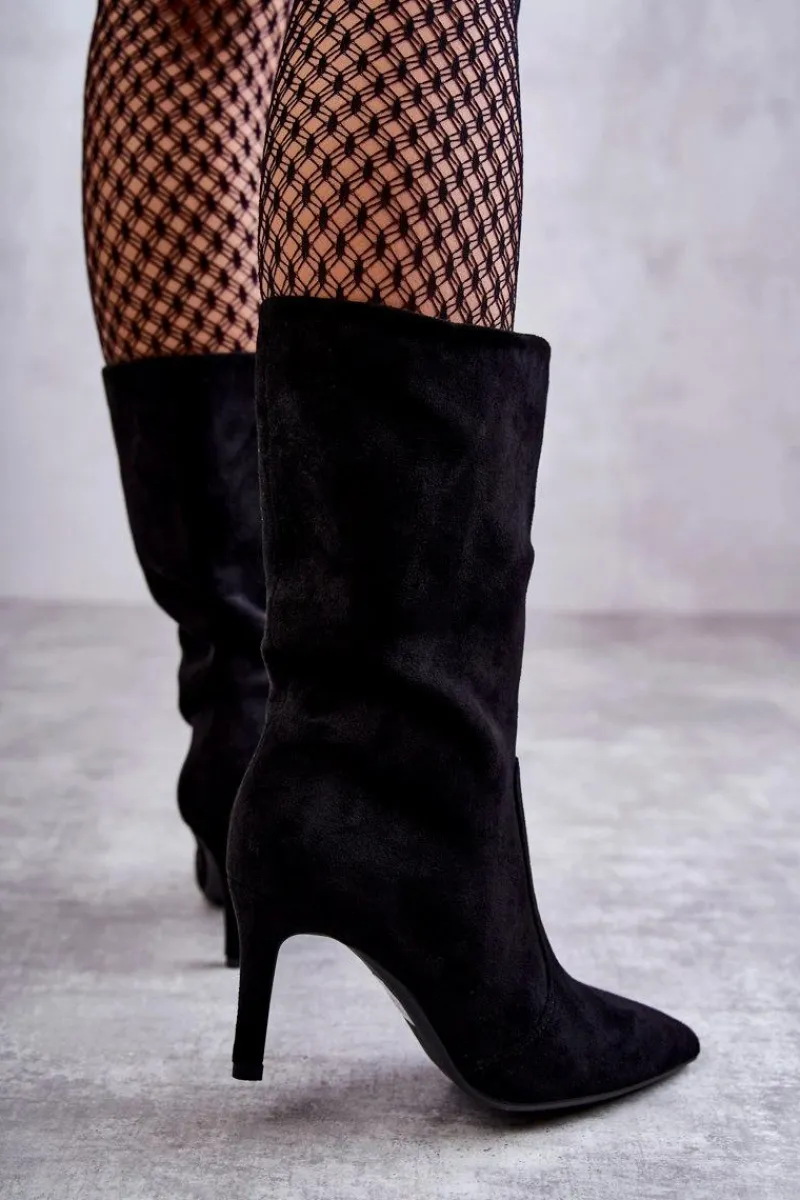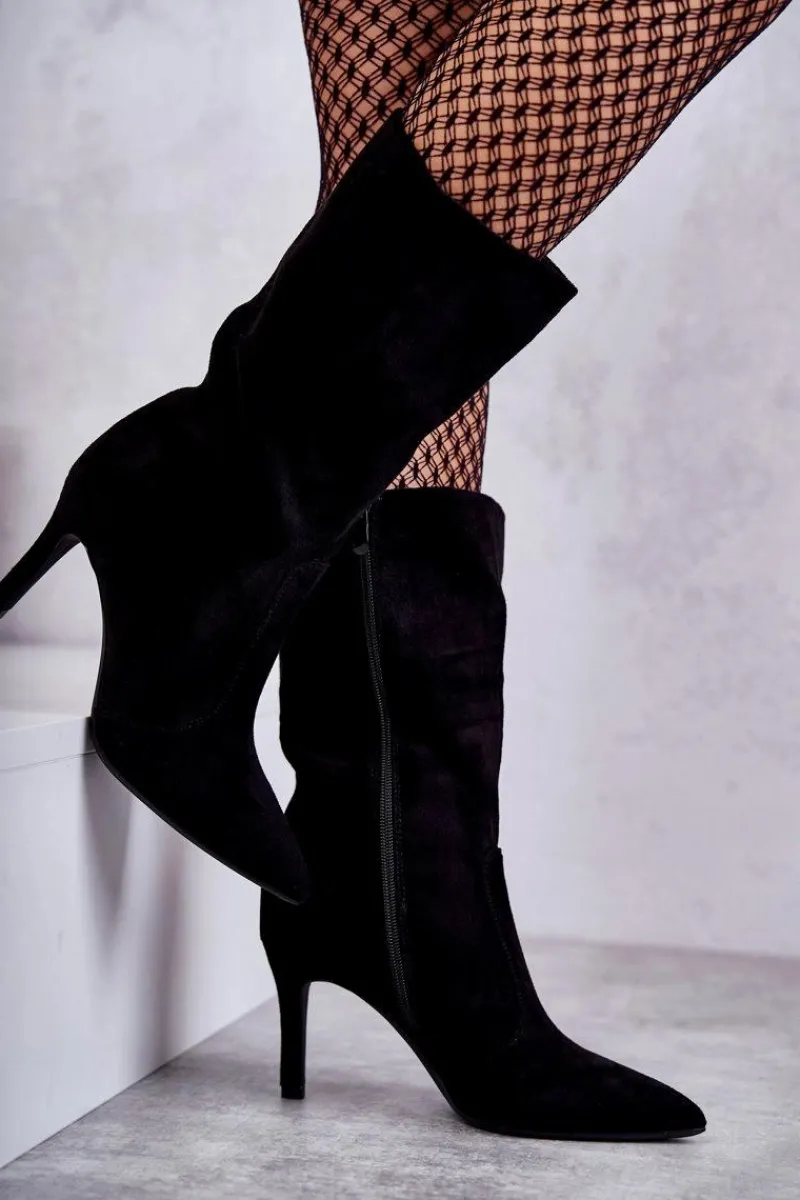 Piękne kozaki z cholewką do połowy łydki. Zostały wykonane z eko zamszu. Osadzone na obcasie w postaci niewysokiej szpilki. Posiadają usztywniany zapiętek. Model z suwakiem na całej długości cholewki. Nosek w szpic optycznie wysmukli stopę. Na pewno wykorzystasz je w wielu stylizacjach! Idealne zarówno do sukienki, jak i spodni. Musisz je mieć! Przy wyborze rozmiaru prosimy sugerować się tabelą rozmiarów.