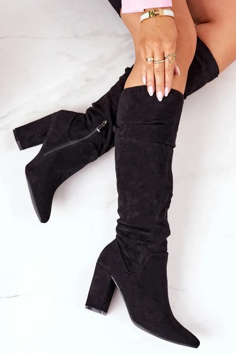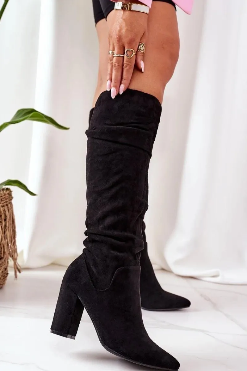 Piękne kozaki na słupku z noskiem w szpic. Cholewka z marszczeniem wykonana jest z miękkiego eko zamszu. Przy wyborze rozmiaru prosimy sugerować się tabelą rozmiarów.