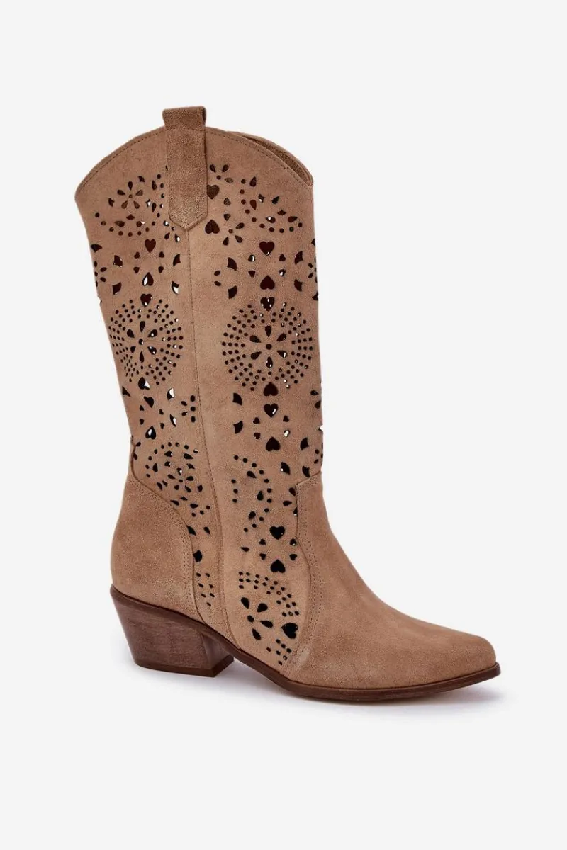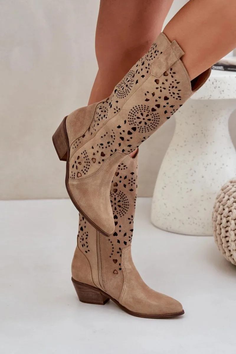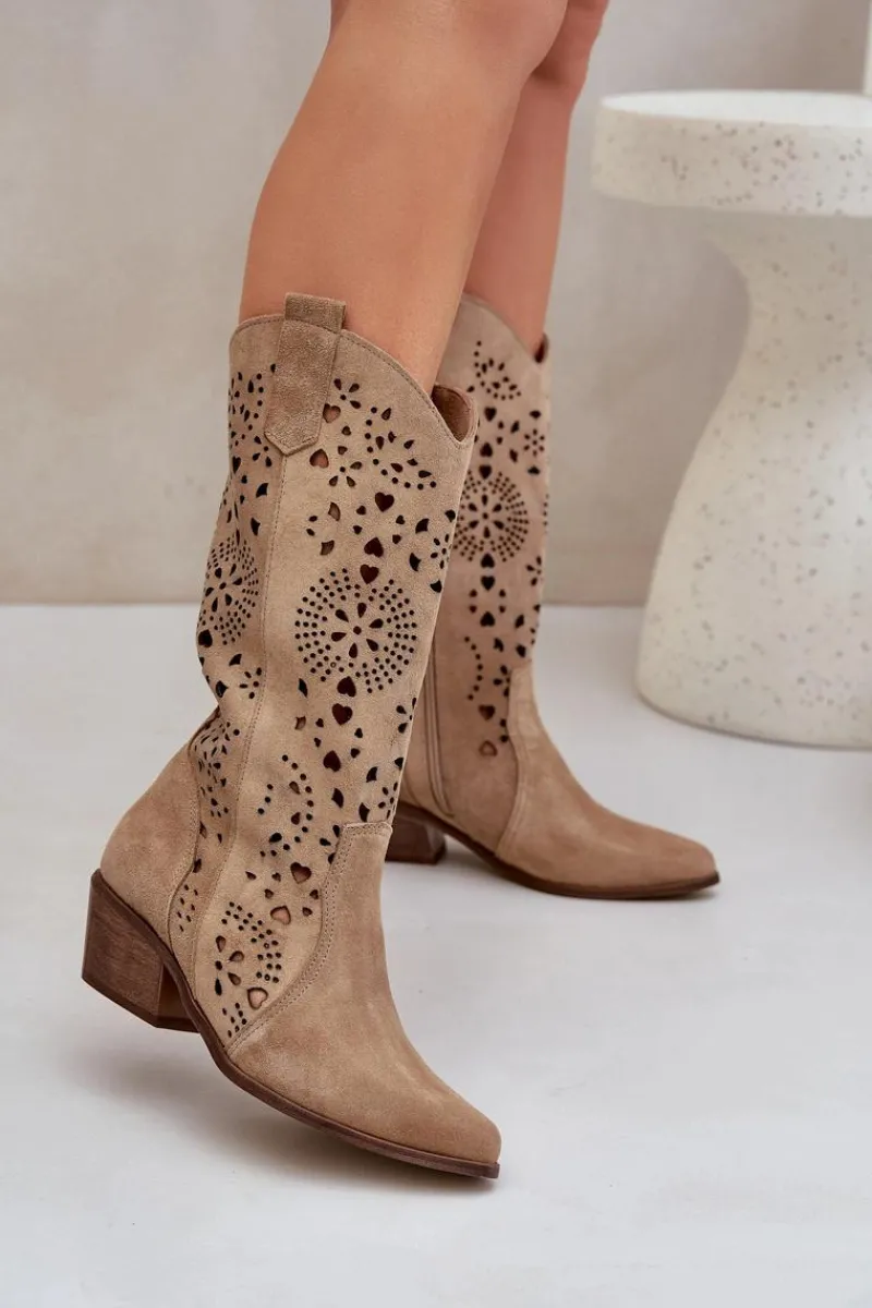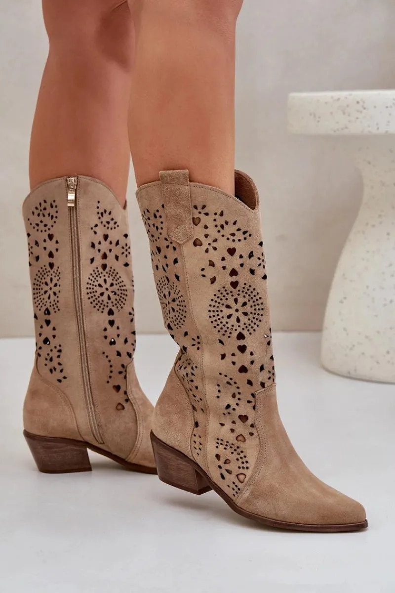 Kozaki z ażurową cholewką do połowy łydki. Model w stylu kowbojek. Zapinane na suwak. Noski w szpic optycznie wysmuklą nogi. Miękka, skórzana wkładka zapewni wygodę podczas użytkowania. Ażurowe kozaki to idealny wybór do wielu stylizacji! Przy wyborze rozmiaru prosimy sugerować się tabelą rozmiarów.