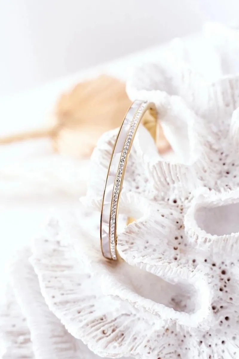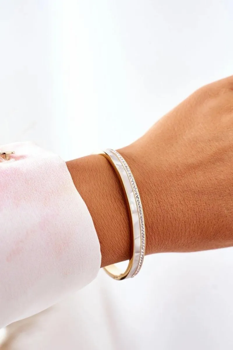 Bransoletka wykonana jest ze stali nierdzewnej, ozdobiona mieniącymi się cyrkoniami oraz kamieniem o perłowym wykończeniu.